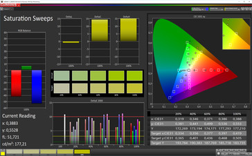 Kontrast und Schwarzwert sind beim Oukitel K4000 Pro hervorragend, auch wenn die guten Werte in der geringen Helligkeit des Displays zugrunde liegen. Wo das Gerät jedoch deutliche Defizite aufzeigt, ist die Farbwiedergabe: Delta-E-Abweichungen von 9,01 (Farbgenauigkeit ) und 8,67 (Graustufen) sind selbst für diese Preisklasse unterdurchschnittlich. Auch die Abweichungen zum Referenzfarbraum sRGB sind recht hoch. Die Messungen des Colorimeter (Software CalMAN) ergab eine etwas zu kühle Farbwiedergabe (7641 K). Im Alltag ist das allerding kaum sichtbar.