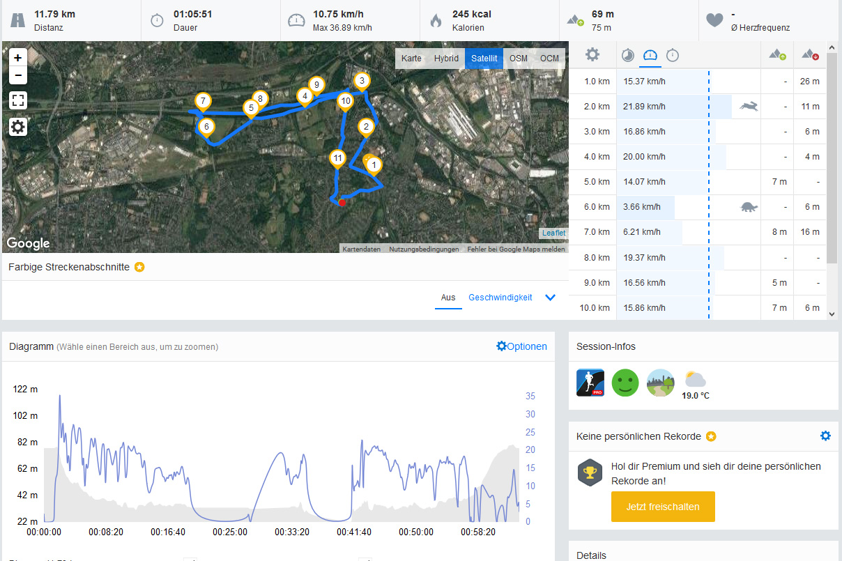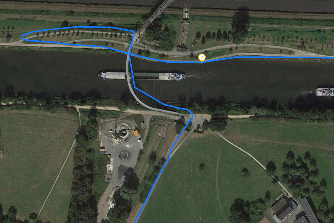 Auf unserer Fahrradtour, auf der sich das K6000 Plus mit dem eigens für Radfahrer entwickelten Garmin Edge 500 messen muss, liegt es mit diesem über weite Teile der Strecke fast in der Spur; mit einer Differenz von 140 Metern ist die Messdifferenz bei knapp 12 Kilometern insgesamt dann auch entsprechend gering. Dass auf das Smartphone-Navi im Zweifel aber weniger Verlass ist, als auf das Profi-Navi, zeigt sich vereinzelt immer wieder, und deutlich im Bereich der Kanalbrücke.