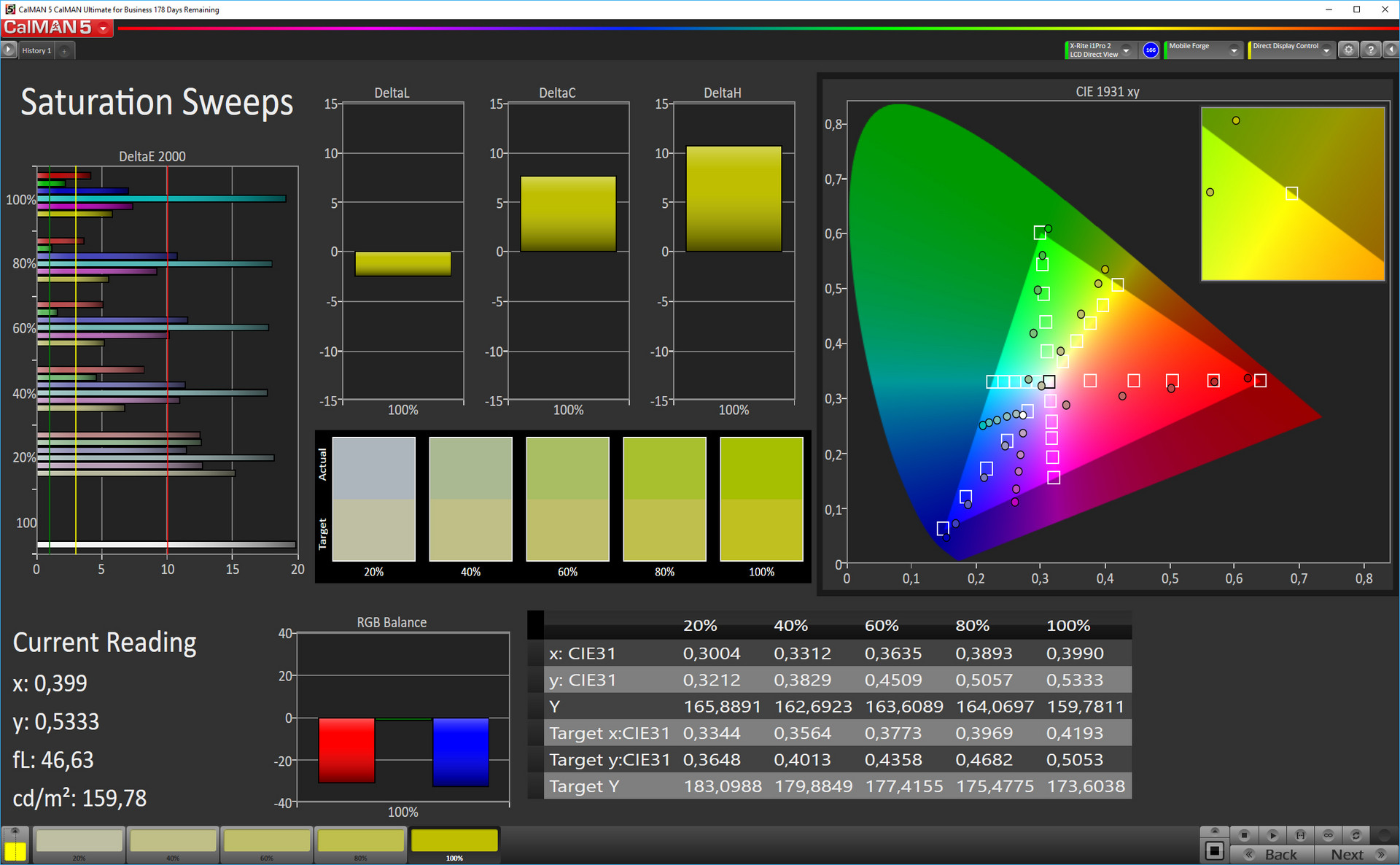 | Delta E Graustufen * | 13.9 | 4.7 66% | 14.4 -4% | 5.9 58% | 4.8 65% | 10.5 24% |