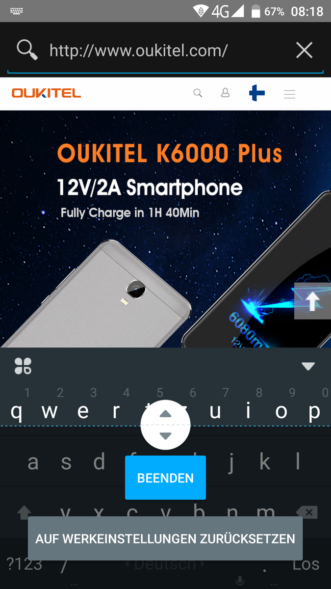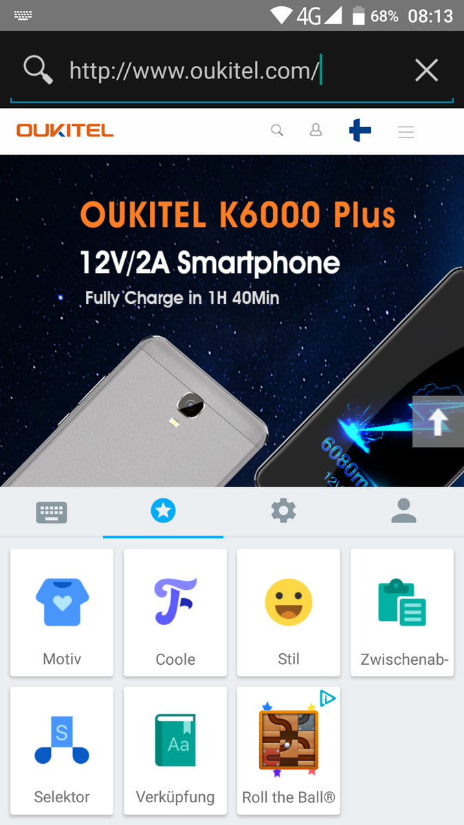 Google's Gboard ist installiert, aktiviert war allerdings das ebenfalls vorinstallierte KiKa-Keyboard. Beide zeigen beim Testgerät eine Schwäche, die dem Touch-Display bzw. seiner Kalibrierung zugeschrieben werden muss: (Nur) im unteren Bereich der Tastatur, insbesondere in der rechten unteren Ecke, wo beispielsweise der Punkt (".") sitzt, reagieren beide Tastaturen nur, wenn man den Bildschirm etwas oberhalb der Symbole selbst antippt.