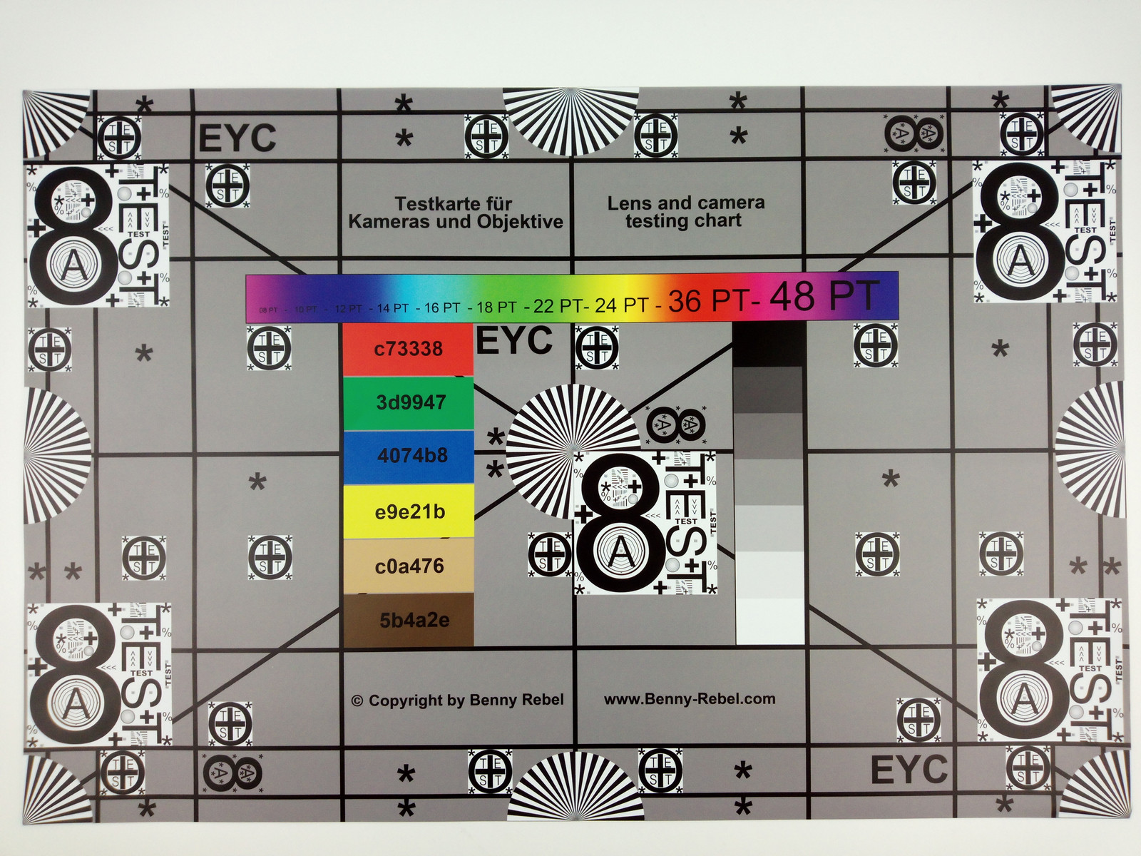 Szene 1Szene 2Szene 3Auch in der Vergrößerung sind die Details der Referenzkarte weder scharf, noch sind Kanten im Bild merklich unscharf, weil die Ränder geglättet werden. An der Farbkarte lässt sich erkenn, dass es insbesondere bei Blautönen zu Farbabweichungen kommt.