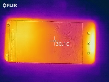 Die Oberflächentemperaturen sind in unseren Messungen niedrig, und die Temperaturentwicklung zeigt sich im Alltag als nicht störend. Während im Geräteleerlauf Temperaturen von 30 °C (Rückseite) nicht überstiegen werden, erreicht das Oukitel U23 unter andauernder Last maximal 33,8 °C.