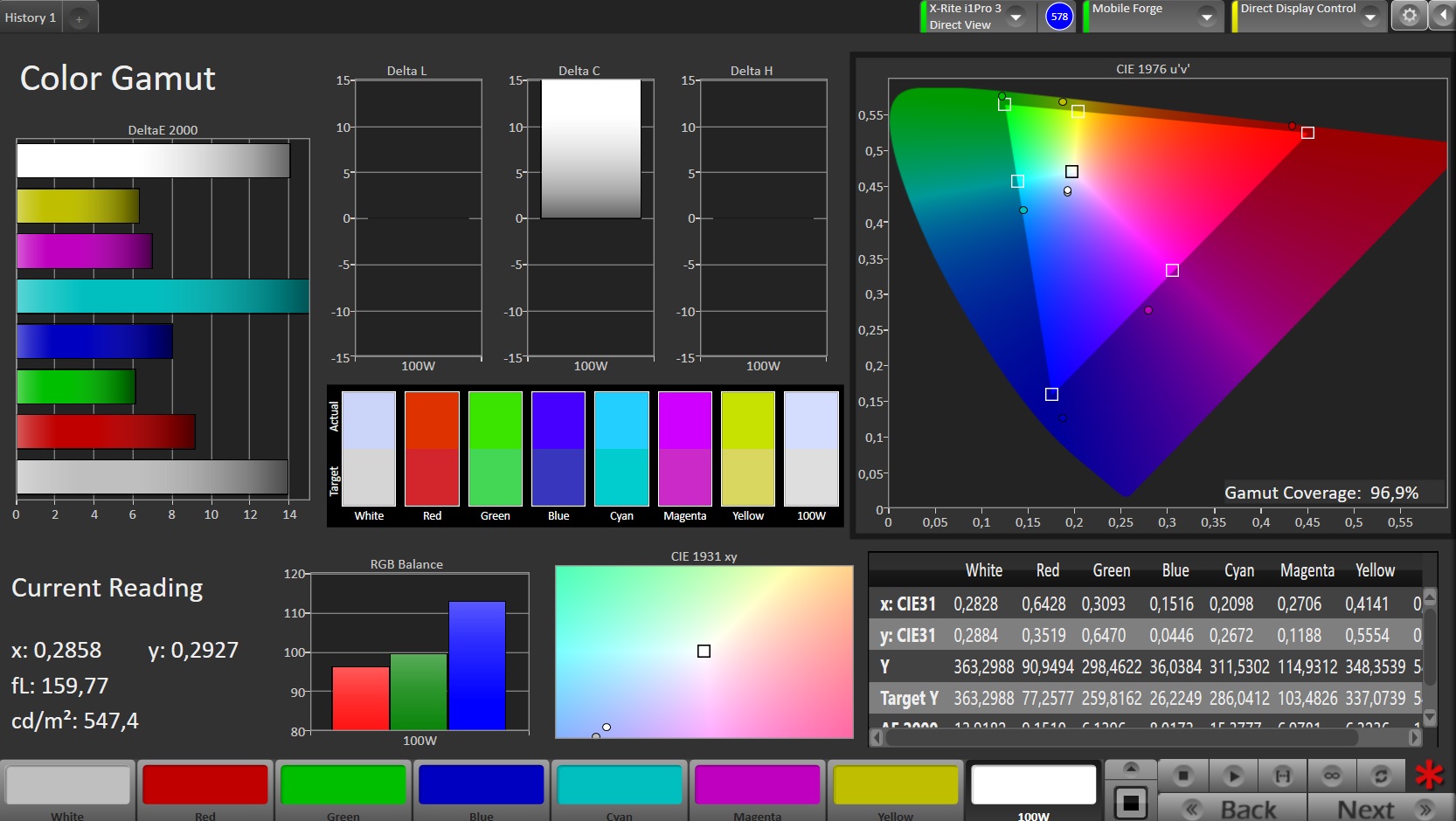 | Delta E Graustufen * | 12.9 | 5.8 55% | 10.6 18% | 1.9 85% |