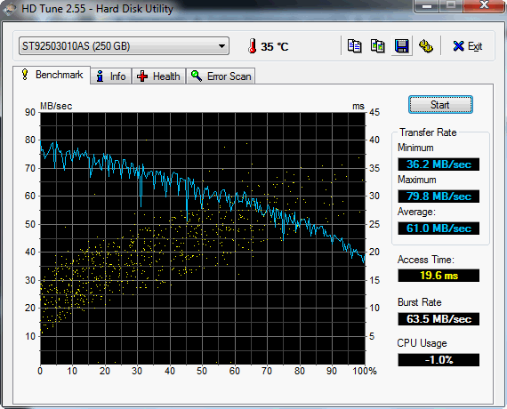 Die Seagate Momentus Thin Festplatte (Typ ST92503010AS, 7mm Höhe) mit einer Bruttokapazität von 250 GByte arbeitet mit den üblichen 5400 U/Min. Sie schiebt mit einem Durchschnittswert im sequentiellen Lesen von 61 Megabyte pro Sekunde (HDTune) eine relativ ruhige Kugel. Akustisch ist sie durch ein helles Klackern vernehmbar. Der Datendurchsatz liegt im Durchschnitt vergleichbarer 2.5-Zoll Festplatten. Der HDD Score des PCMark Vantage zeigt daher ebenfalls nur Durchschnittlichkeit: 2.977 Punkte. Festplatten mit 7.200 RPM liegen bei zirka 3.500 Punkten.