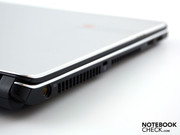Bei den Anschlüssen fällt das geringe Platzangebot auf der rechten und linken Gehäuseseite auf. Es gibt statt Einem gleich zwei Luftauslässe an der linken Seite. Diese werden auch von zwei Lüftern bedient. Daher reicht der Platz trotz des Fehlens eines optischen Laufwerks nur für wenige Ports. Die dünne Frontpartie bestückt der Hersteller nur mit dem Kartenleser. Alle Anschlüsse finden wir rechts oder links. Die Rückseite bleibt dem weiten Aufklappwinkel des Displays vorbehalten.