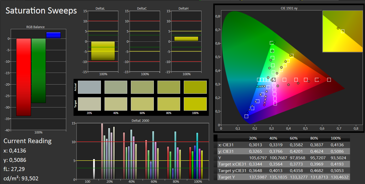 Wir haben das Display im Auslieferungszustand vermessen (Zielfarbraum sRGB). Die DeltaE-2000-Abweichungen fast aller Farben liegen oberhalb eines Wertes von fünf. Lediglich die Farbe Blau befindet sich im Zielbereich (DeltaE kleiner 5). Das Display besitzt zufolge einer Verschiebung von Cyan und Magenta in Richtung Blau dennoch einen sichtbaren Blaustich.