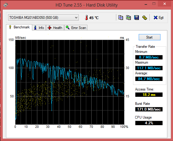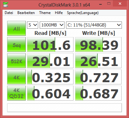 Packard Bell stattet das Easynote mit einer Toshiba Festplatte aus. Sie besitzt eine Kapazität von 500 GB und arbeitet mit 5.400 Umdrehungen pro Minute. CrystalDiskMark meldet eine Lesegeschwindigkeit von 101,6 MB/s. HD Tune liefert eine durchschnittliche Transferrate von 84,7 MB/s. Hierbei handelt es sich um gute Werte für eine 5.400er-Festplatte.