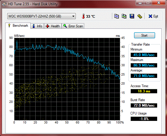 1000 GByte Festplattenspeicher bieten auch größeren Datenmengen ausreichend Platz. Packard Bell integriert zwei 500-GByte-HDDs von Western Digital (WD5000BPVT-22HXZT3), die mit 5400 U/Min laufen. Eine sequentielle Lese- und Schreibrate von rund 82 MB/Sek (CrystalDiskMark) ist weder lahm noch ungemein flott, sondern orientiert sich am Mittelfeld. Die Zugriffszeit beträgt laut HDTune durchschnittlich 19.2 ms – ein passabler Wert.