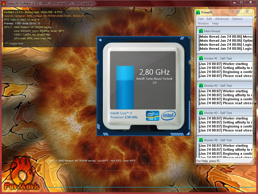 Beim Testgerät funktionierte die automatische Übertaktung einwandfrei. Unter Last war der Turbo stets aktiv und beschleunigte den Core i5-2450M um mehrere 100 MHz. Im Single-Core-Rendering des Cinebench R10 lief der Zweikerner mit 3.0-3.1 GHz, im Multi-Core-Rendering mit ungefähr 2.9 GHz. Der Stresstest förderte 2.5-2.9 GHz zutage.