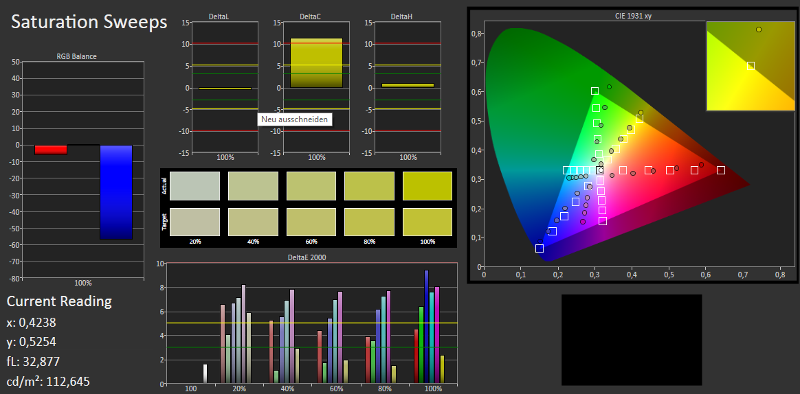 Die Referenzfarbräume kann das Testgerät nicht abdecken, lediglich bei gelben Farbtönen geht es darüber hinaus. Allerdings sind diese auch nur für professionelle Anwendungen relevant, im Alltag sind kaum Einschränkungen zu erwarten.