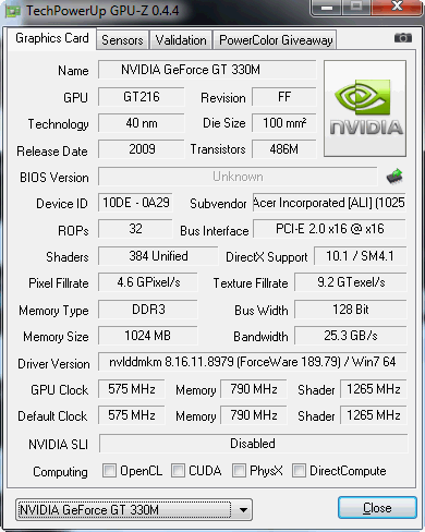 Als GPU ist eine Nvidia GeForce GT 330M mit 1.024 MB DDR3 Speicher verbaut. Der Kern taktet mit 575 MHz, der Speicher mit 790 MHz. Die DirectX-10.1 GPU gehört zu Nvidias Mittelklasse. Wie üblich für ein Notebook dieser Preiskategorie sind 4.096 MB DDR3 Arbeitsspeicher an Bord (zwei Sockel, zugänglich).