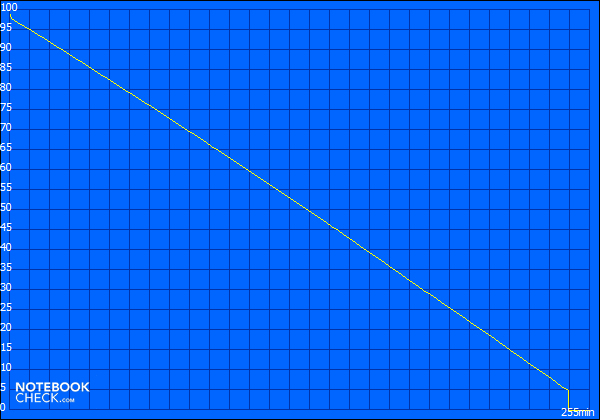 Mit dem Tool „Battery Eater“ führen wir unterschiedliche Laufzeiten-Messungen durch. Der Classic Test simuliert eine Open GL Berechnung bei maximaler Bildschirmhelligkeit, aktivierter WLAN-Verbindung und deaktivierten Stromsparfunktionen (Hochleistungsprofil). Nach guten 4 Stunden und 15 Minuten muss eine externe Stromquelle aufgesucht werden. Das Acer Aspire One 522 als Gegenstück mit AMD-Hardware ermöglicht bei dieser Messung nur eine Laufzeit von 3 Stunden und 21 Minuten. In der realitätsnahen Messung „Surfen über WLAN“ bei einer angenehmen, aber nicht maximalen Bildschirmhelligkeit überzeugt das Packard Bell dot SE mit einer Laufzeit von 6 Stunden und 27 Minuten. Das Acer Aspire One D255 mit identischer Ausstattung bietet nahezu gleiche Laufzeiten mit kleinen Messunterschieden.
