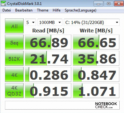 Als Speichermedium verwendet Packard Bell eine Western Digital Blue Scorpio Festplatte, die die Typenbezeichnung WD2500BEVT-22A23 trägt. Bei maximal 5400 Umdrehungen pro Minute bietet das Laufwerk eine Kapazität von mittlerweile üblichen 250 GByte. HD Tune Pro und der CrystalDiskMark attestieren ein durchschnittliches Ergebnis. Die Übertragungsraten erreichen in der Spitze Werte zwischen 56,2 und 66,9 MByte pro Sekunde. Auch die Zugriffszeit von 19,5 Millisekunden liegt im Durchschnitt. Dank standardisiertem SATA-Connector lassen sich eine schnelle Festplatte, ein Hybrid-Laufwerk oder ein modernes Solid State Drive nachrüsten.