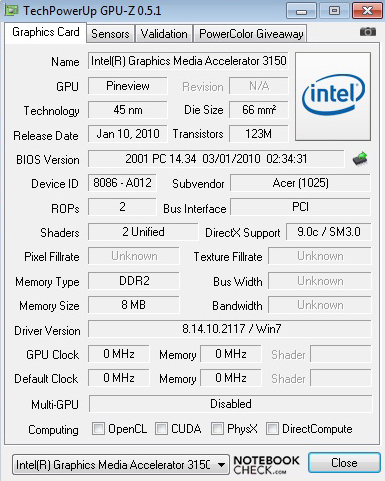 Die integrierte Prozessor-Grafik GMA 3150 ist nicht für 3D-Anwendungen konzipiert. In den synthetischen Spielebenchmarks von Futuremark bestätigt sich dies. Im 3DMark 2006 erreicht das dot SE 144 Punkte in der Gesamtwertung und liegt damit am Ende unserer Datenbank. Im Umfeld finden sich Netbooks auf Intel Atom Basis. Darunter beispielsweise das Aspire One 532, mit einem älterem Atom N450, vom Mutterkonzern Acer. Die 3D-Leistung bei Games kann wie erwartet auch bei minimalen Settings nicht überzeugen und ein flüssiges Spielen ist nicht möglich.
