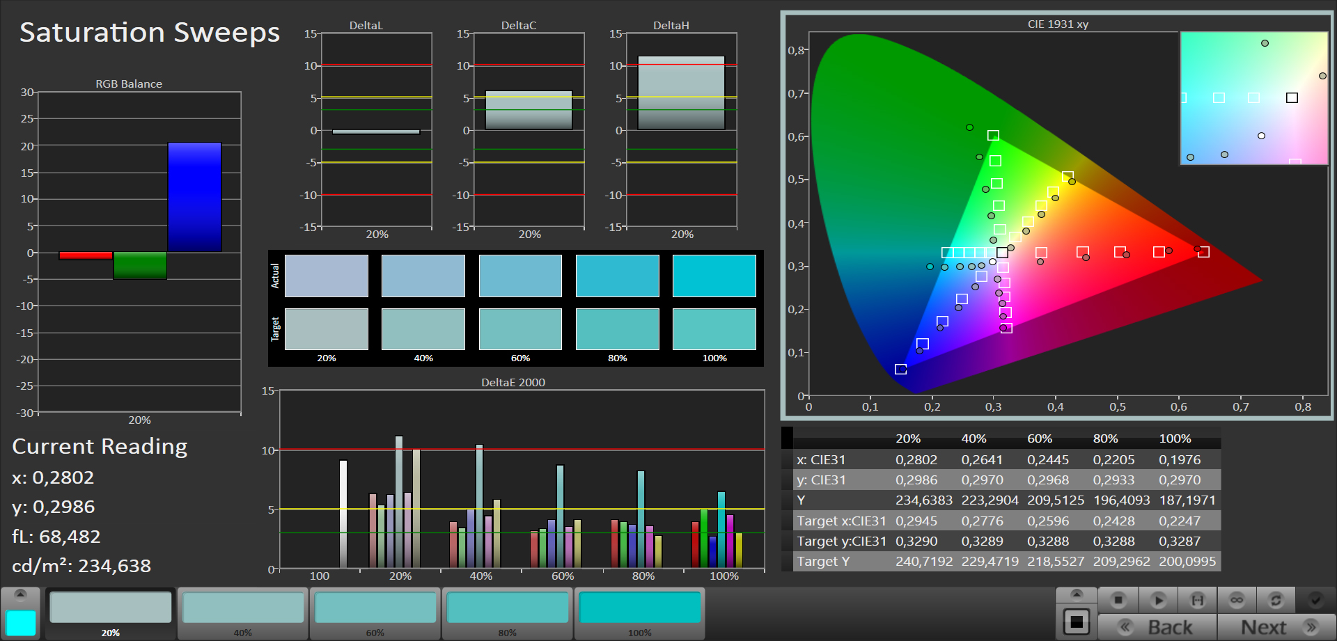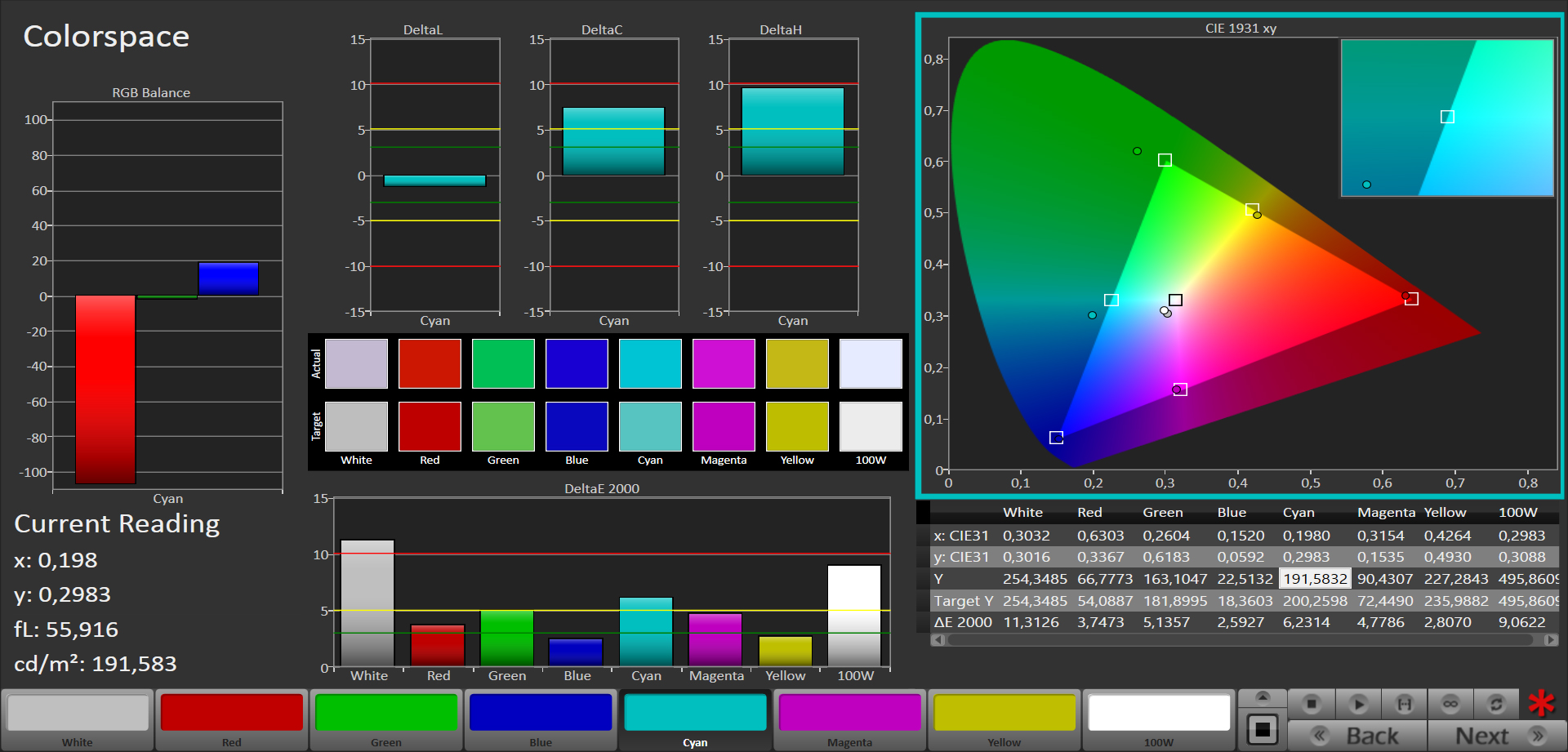 Die Farbgenauigkeit ist für Geräte dieser Klasse sicherlich nicht von entscheidender Bedeutung, aber dennoch haben wir mal einen Blick darauf geworfen. Gerade bei den Graustufen fällt hier der sichtbare Blaustich ins Auge, was in einem hohen DeltaE von 8,6 resultiert. Bei den Farben sieht das schon besser aus, auch wenn für das geübte Auge die Abweichungen auch hier sichtbar sind.