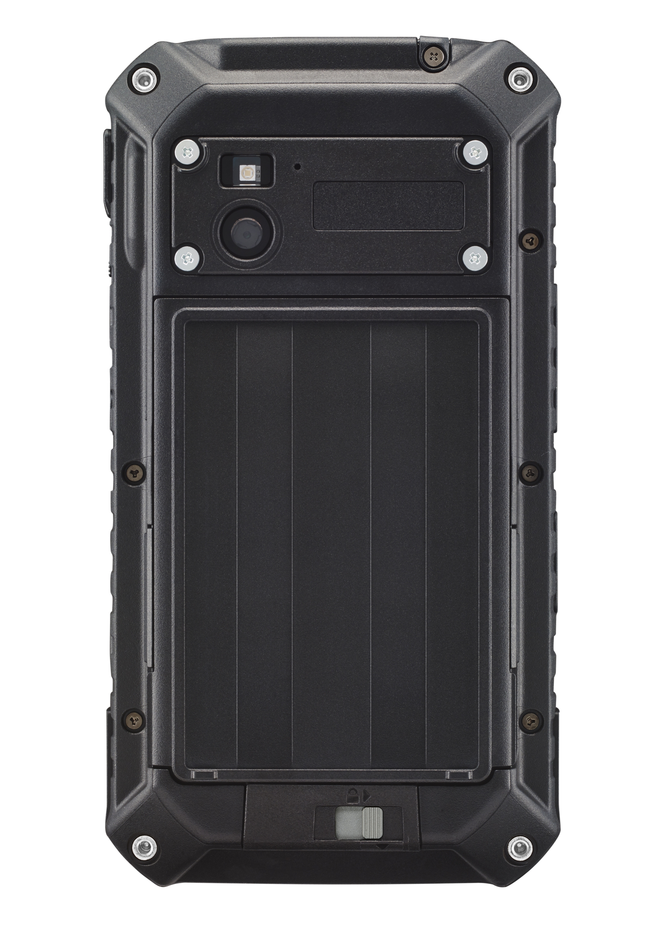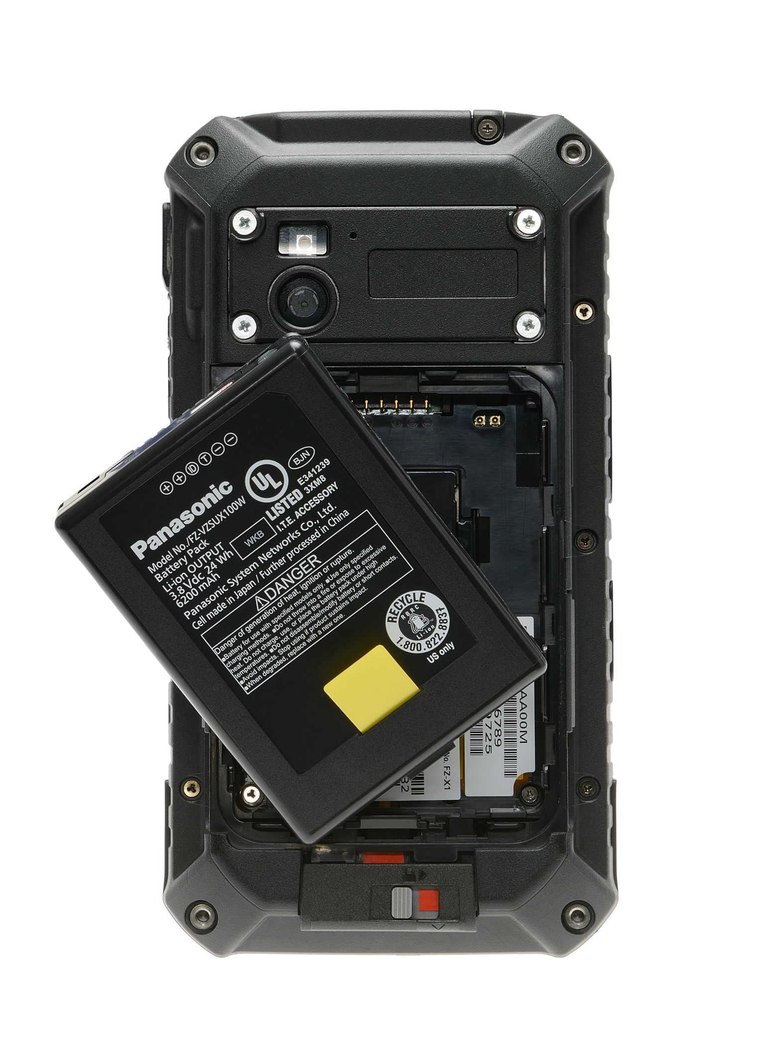 Der Akku des TougPad FZ-E1 ist nicht nur wechselbar, sondern wird zudem auch noch bei Bedarf beheizt, um die offerierten Betriebstemperaturen zwischen -20 und +60 °C zu ermöglichen. Außerdem ist es möglich, den Akku im laufenden Betrieb auszutauschen, ohne das Gerät aus- und wieder einschalten zu müssen. Unter dem Akku findet sich Platz für eine Micro-SIM- und MicroSD-Karte.