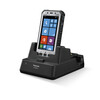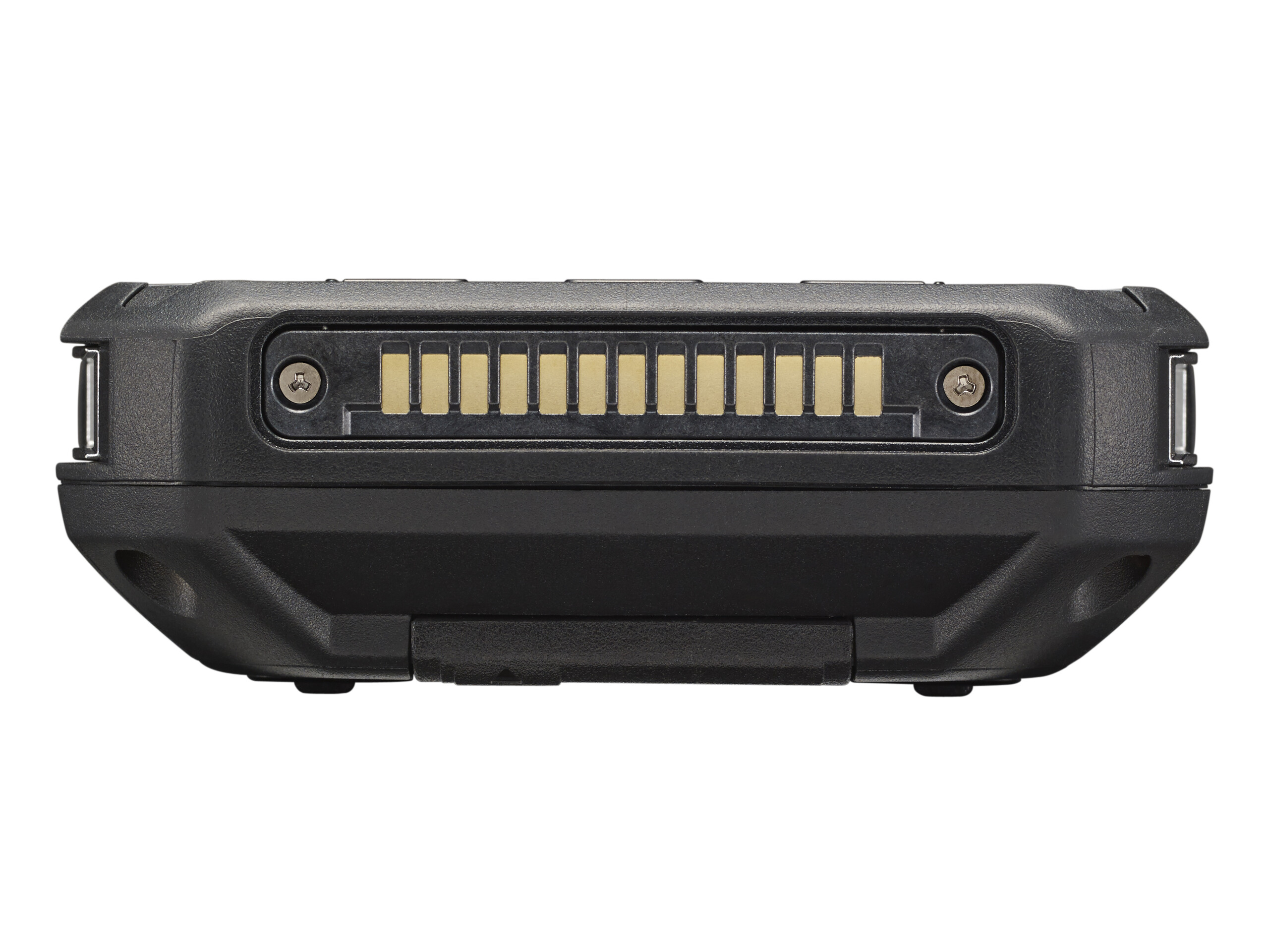 Das Gerät lässt sich zudem mit verschiedenen optionalen Halterungen und Ladestationen verwenden. Dafür sind robuste Metallschienen mit dem Gehäuse verschraubt, und es gibt sowohl an der Fußseite als auch hinter einer Kunststoffabdeckung neben der Kamera Kontaktflächen, um den Handheld laden zu können.