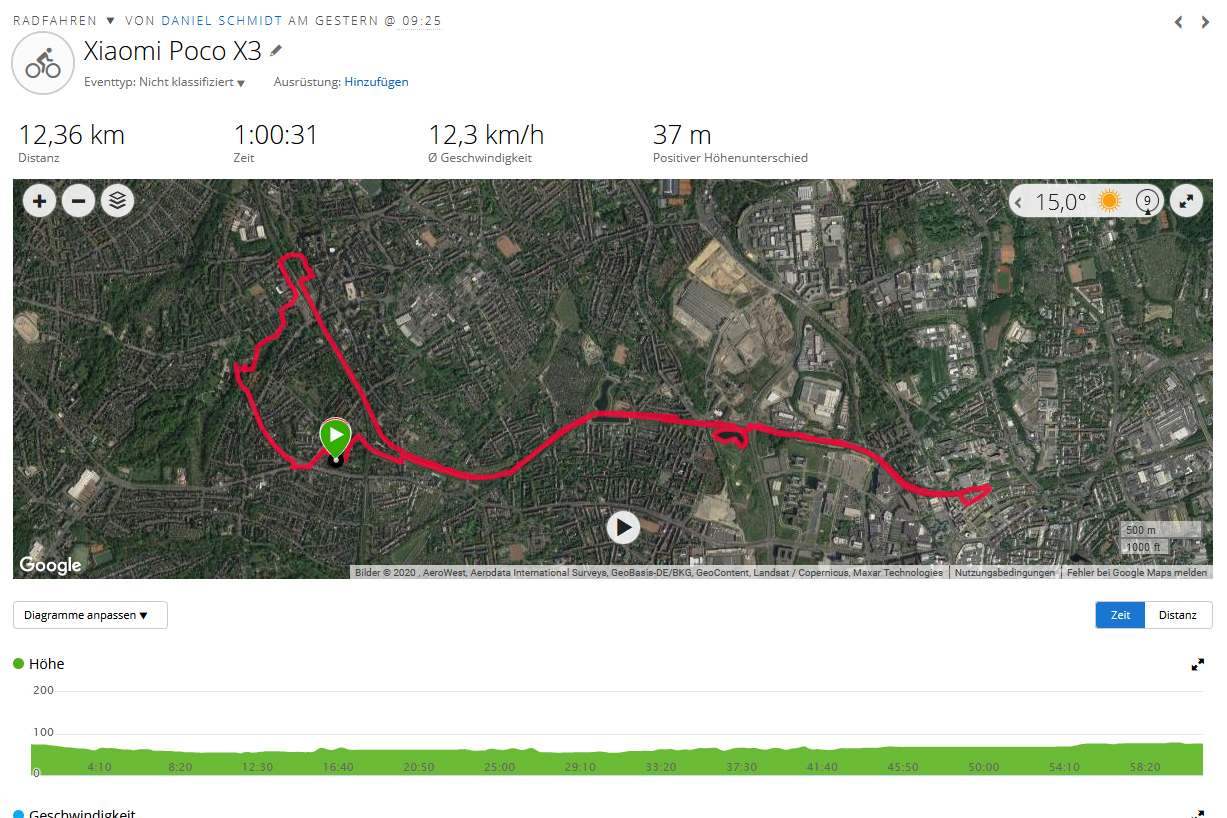 Auf einer kleinen Radtour muss sich das Xiaomi-Handy dem Vergleich mit dem Fahrradcomputer Garmin Edge 500 stellen. Bereits bei der Gesamtlänge der Strecke gibt es eine Differenz von 200 Metern zwischen den beiden Geräten. Ein Blick in den detaillierten Streckenverlauf bescheinigt dem Smartphone dabei die geringere Exaktheit. Für Navigationsaufgaben reicht die gebotene Leistung sicherlich aus, wer jedoch eine genaue Streckenaufzeichnung wünscht, wird bessere Smartphones finden.