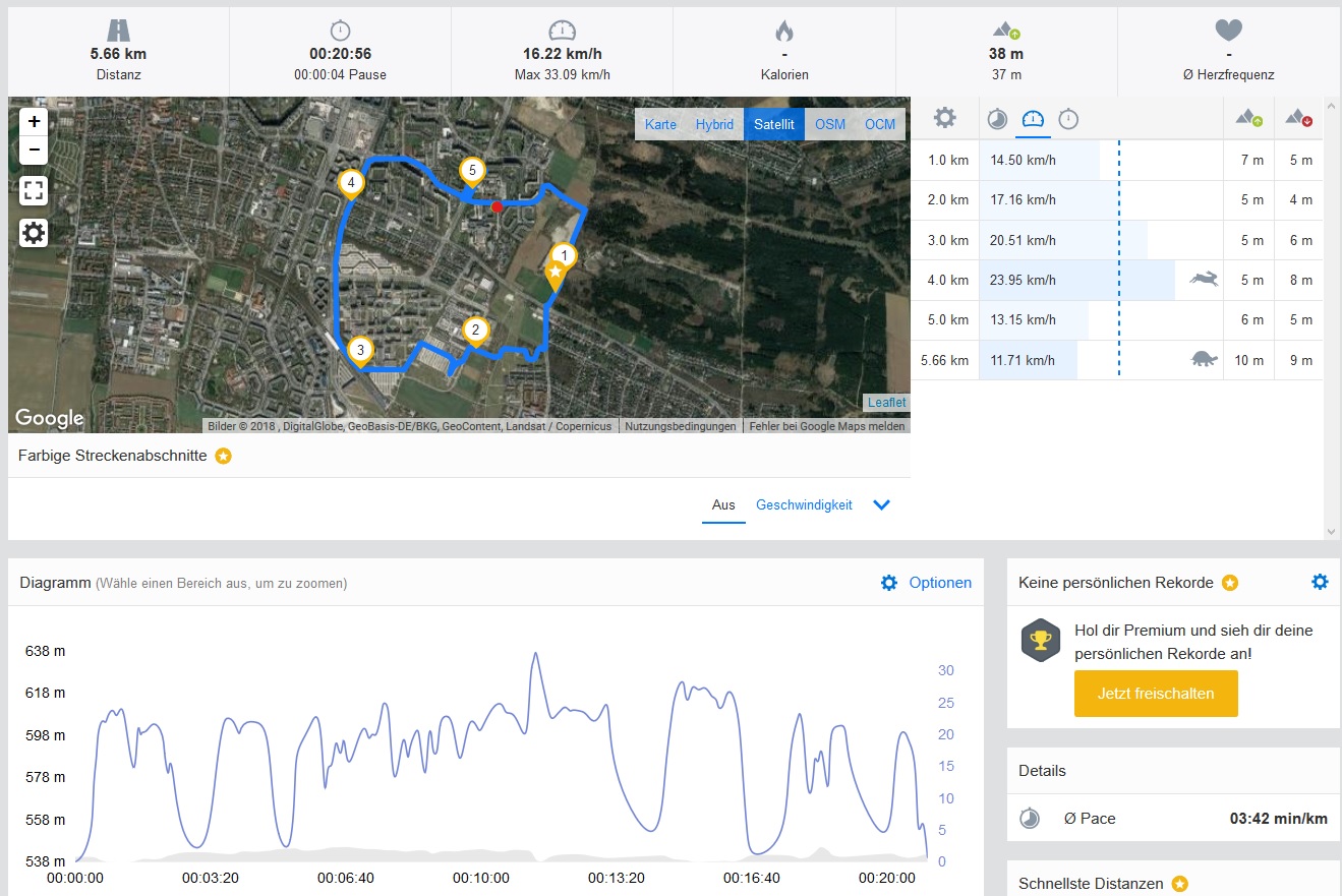 Circa 230 Meter weniger misst das Huawei Mate RS in unserem Praxistest zur Ortungsgenauigkeit als das Profi-Navi Garmin Edge 520. Das ist bei einer Strecke von 5,6 Kilometer eine durchaus spürbare Abweichung. Und sie verwundert nicht, wenn man sich die Details anschaut: Das Mate RS nutzt deutlich weniger Navigationspunkte und kürzt deshalb gefahrene Strecken oft ab. Auch liegt die Markierung, die das Mate RS setzt, oft neben dem Weg. Da arbeiten andere High-End-Smartphones exakter, wer aber nicht auf hundertprozentige Genauigkeit angewiesen ist, der kann das Handy von Porsche Design durchaus für die Navigation verwenden.