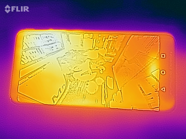 Die Temperaturentwicklung am Gehäuse ist bedenklich hoch: Im oberen Bereich der Vorderseite erreichen wir unter längerer Volllast 48,3 °C. Das ist schon sehr nahe an der kritischen 50 °C-Marke, ab der es wirklich unangenehm wird, das Smartphone in der Hand zu halten. Auch im Sommer macht die Erwärmung Probleme, wenn man das Smartphone beispielsweise nach einer längeren Gaming-Session in die Hosentasche stecken will. Die Erwärmung nimmt zwar nach unten hin ab, ist aber auch dort noch sehr deutlich spürbar.