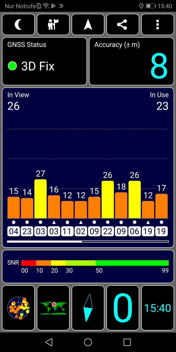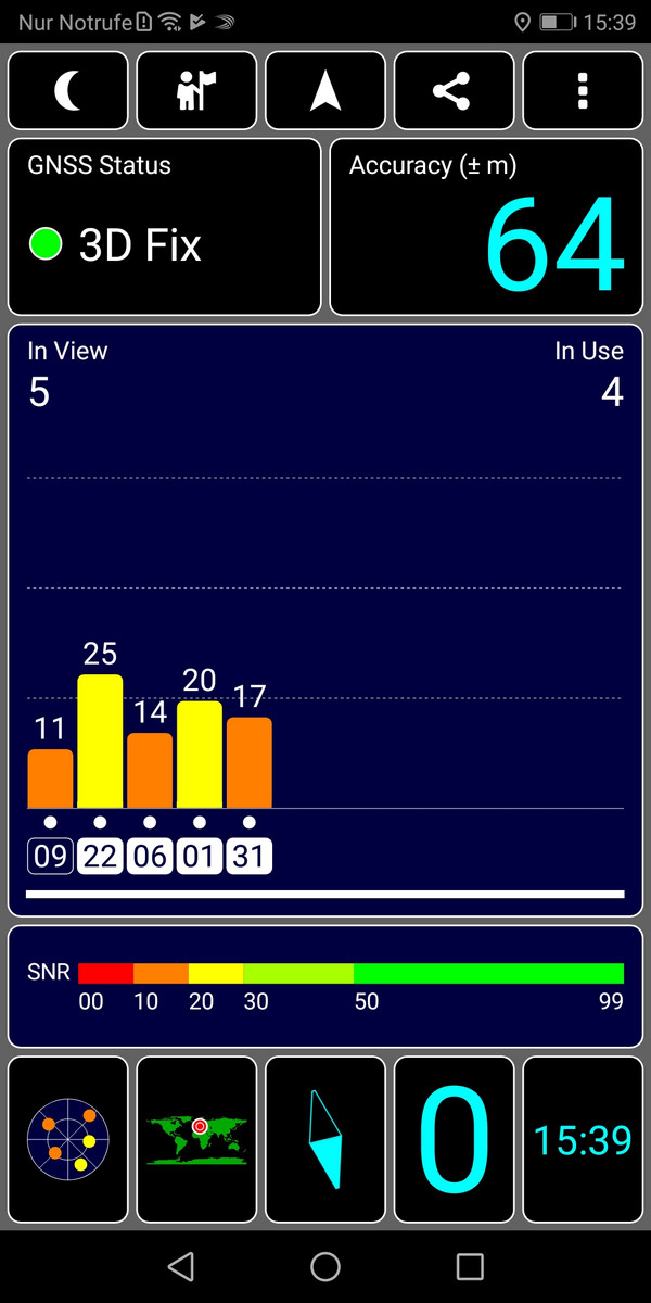 In Innenräumen mit Betondecke ist nur eine sehr ungenaue Ortung möglich, nahe am Fenster ist die Genauigkeit mit 8 Meter aber schon recht ordentlich. Im Freien steigt sie nochmals auf 6 Meter an, was ein zufriedenstellender Wert ist. Die Ortung in Google Maps erfolgt flott und der Kompass zeigt sehr schnell die korrekte Blickrichtung an.