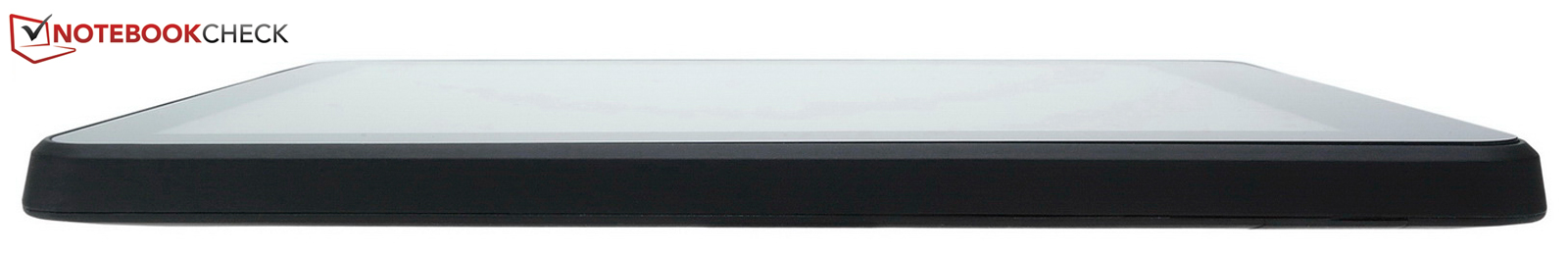 Seitlich rechts beherbergt das Tablet Multipad PMP5080B den Anschluss für den Netzadapter, einen Mini-HDMI-Videoausgang, die Öffnung für das integrierte Mikrofon, den Mini-USB-2.0-Anschluss (Host) und eine Buchse für Ohr- oder Kopfhörer. Die Schnittstellen sind ungeschützt, Abdeckungen oder Schutzkappen für die Ports fehlen am Multipad PMP5080B von Prestigio.