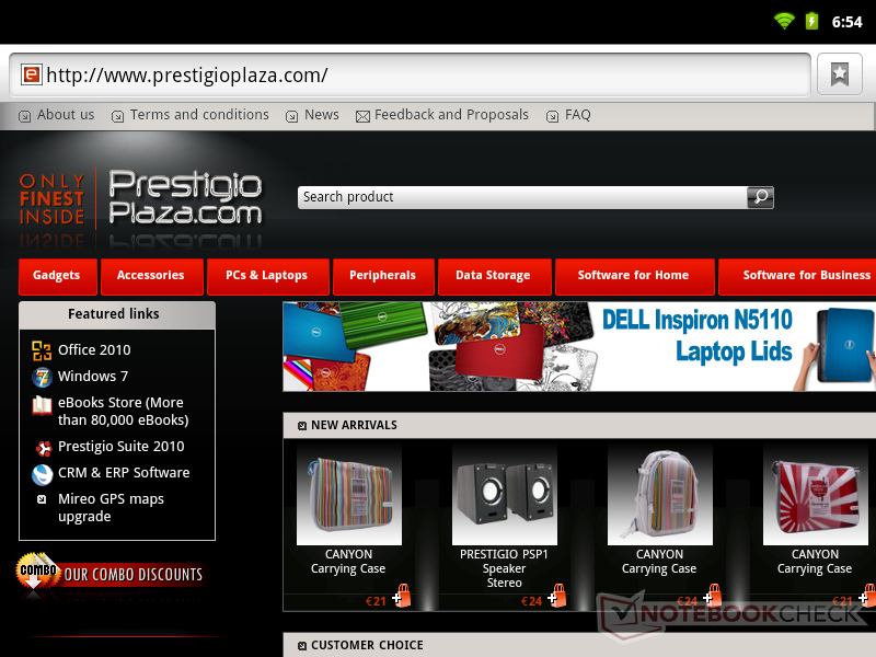 Android 2.3 Gingerbread unterstützt unter anderem das WebM Video-Containerformat und integriert einen SIP-Client für VoIP. Davon profitiert das Multipad PMP5080B im Betrieb beispielsweise bei der Wiedergabe von Full-HD-Videos spürbar, da das Prestigio-Tablet mit dem Applikationsprozessor RK2918 von Rockchip rechnet. Mehr dazu im weiteren Test bei Kapitel „Leistung“. Flash-Inhalte: Das PMP5080B unterstützt auch Adobe Flash 10.1.