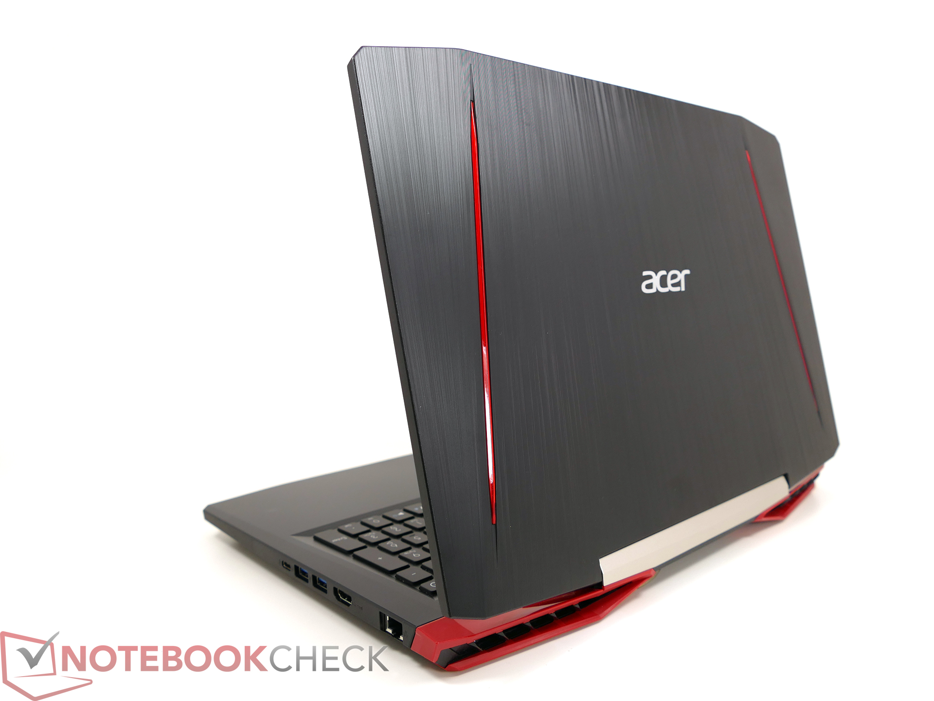 Bei der Optik setzt Acer ganz ähnlich der GL-Serie von Asus auf ein durchgehend mattschwarzes Gehäuse mit roten Akzenten. Diese findet man in Form von zwei Zierleisten am Displaydeckel, den rot eingefassten Lüfteröffnungen an der hinteren Kante sowie der roten Einfassung des Touchpads und der roten Tastaturbeleuchtung. Die zentrale Scharnier-Deckleiste wurde in Silber ausgeführt.