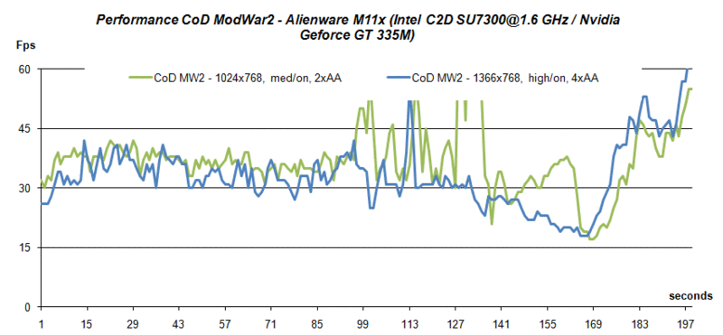 Vergleicht man die erreichten Werte mit anderen von uns getesteten Grafiklösungen (Spieleleistung mobiler GPUs), lässt sich beobachten, dass die GPU bei hohen Grafikeinstellungen wie erwartet auf dem Niveau zwischen einer Geforce 9700M und der beliebten HD 4650 liegt. Bei mittlerer Detailstufe hängt das Alienware M11x etwas nach, was vor allem auf das Konto der eingesetzte SU 7300 CPU gehen sollte.