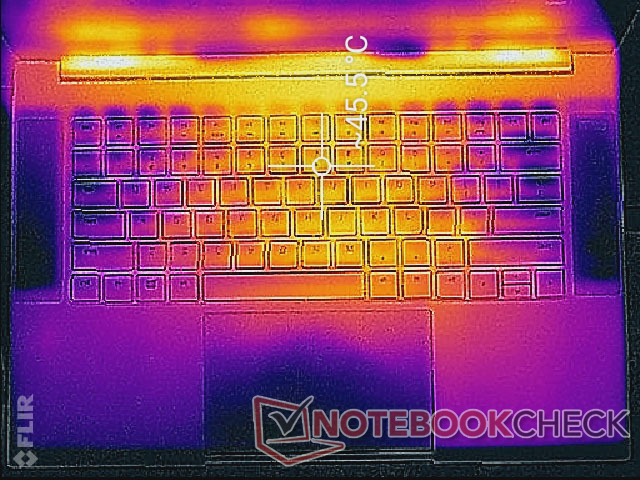 Mit 30 °C bis 34 °C auf beiden Seiten werden die Oberflächen im Leerlauf auf dem Desktop warm. Außerdem erwärmen sich durch die Metallkonstruktion aus einem Guss auch die Handballenauflagen relativ stark. Im Gaming-Betrieb können die Handballenauflagen und WASD-Tasten 37 °C oder mehr erreichen, was wiederum zu schwitzigen Händen führen kann. Hier wären kühlere Temperaturen wünschenswert.