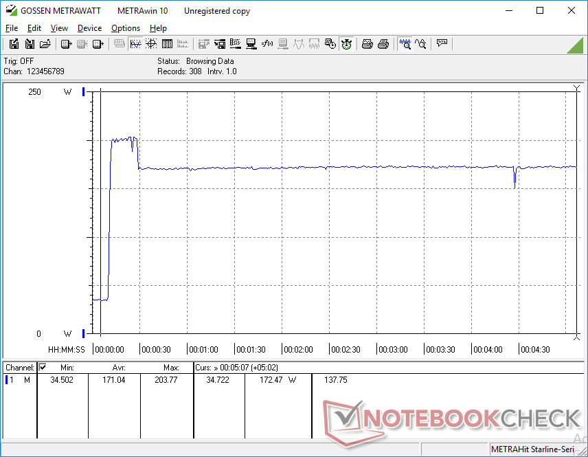 Der maximale Verbrauch, der dem mittelgroßen (17 x 7 x 2,5 cm) 230-W-Netzteil während der gleichzeitigen Ausführung von Prime95 und FurMark abverlangt wird, liegt bei 203,8 W. Im Laufe der Zeit fällt dieser Spitzenwert und stabilisiert sich bei 172,5 W, wie unsere Diagramme unten zeigen. Bei allen Basis- und Profimodellen des Blade 15 2020 befindet sich das gleiche 230-W-Netzteil im Lieferumfang.