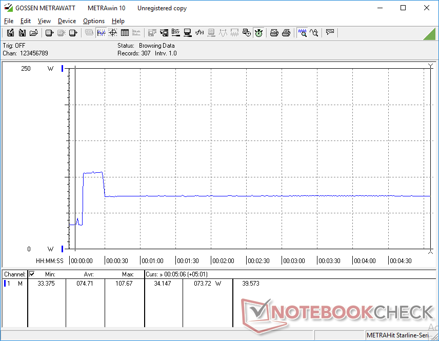 Bei der Ausführung von Prime95 springt die Energieaufnahme schlagartig auf 108 W, fällt nach ca. 20 Sekunden ab und stabilisiert sich schließlich bei 74 W. Der 20-sekündige Spitzenverbrauch deckt sich mit dem Zeitfenster, in dem die maximalen Turbo-Boost-Taktfrequenz im obigen Prime95-Stresstest aufrechterhalten wird.