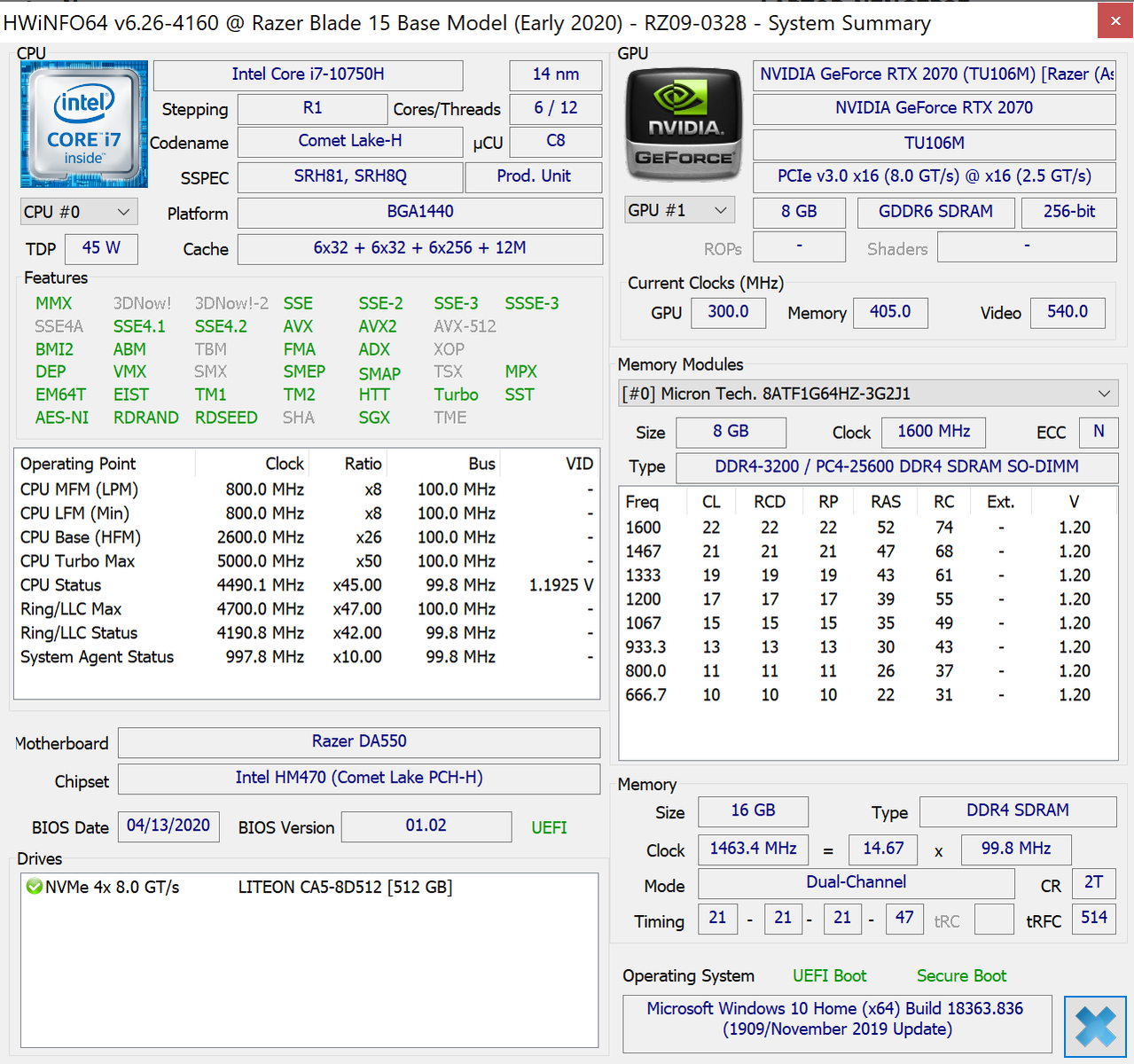 | Razer Blade 15 RZ09-0328 i7-10750H, GeForce RTX 2070 Max-Q, Lite-On CA5-8D512, AMOLED, 3840x2160, 15.6" | MSI GS66 10SGS i7-10750H, GeForce RTX 2080 Super Max-Q, Samsung SSD PM981 MZVLB512HAJQ, IPS, 1920x1080, 15.6" | Razer Blade 15 RTX 2080 Max-Q i7-9750H, GeForce RTX 2080 Max-Q, Samsung SSD PM981 MZVLB512HAJQ, IPS, 1920x1080, 15.6" | Gigabyte Aero 15 OLED XB-8DE51B0SP i7-10875H, GeForce RTX 2070 Super Max-Q, Intel Optane Memory H10 with Solid State Storage 32GB + 512GB HBRPEKNX0202A(L/H), OLED, 3840x2160, 15.6" | Alienware m15 R2 P87F i7-9750H, GeForce RTX 2080 Max-Q, 2x Toshiba XG6 KXG60ZNV512G (RAID 0), IPS, 1920x1080, 15.6" | Xiaomi Mi Gaming Laptop 2019 i7-9750H, GeForce RTX 2060 Mobile, Toshiba XG6 KXG60ZNV512G, IPS, 1920x1080, 15.6" | |