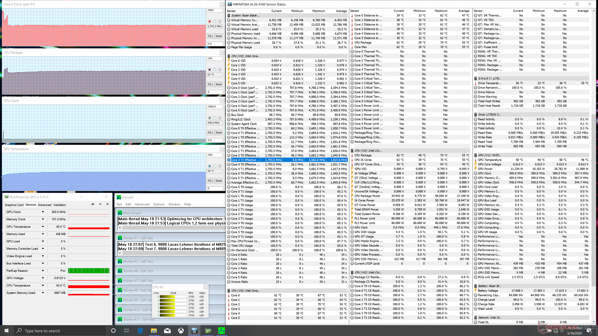 Um es auf potenzielles Drosseln zu prüfen, setzen wir das System künstlichen Lasten aus. Beim Ausführen von Prime95 im Gaming-Modus erhöht die CPU ihren Takt für einige Sekunden auf 4,1 GHz, worauf sie eine Kerntemperatur von 70 °C erreicht. Anschließend fallen die Taktfrequenz und die Temperatur auf 2,7 GHz bzw. 58 °C. Im Creator-Modus pendelt sich die CPU bei einer höheren Taktfrequenz und einer höheren Temperatur von 3,2 GHz bzw. 70 °C ein, wie die Screenshots unten zeigen.