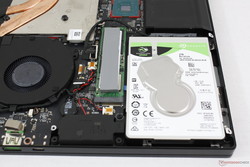 Im direkten Vergleich erkennt man aber einige deutliche Unterschiede, wenn es um den internen Aufbau geht. Zunächst einmal wurde der Akku im Basis-Modell gestutzt, um Platz für die 2,5-Zoll-Festplatte zu schaffen. Dieses Vorgehen kennen wir beispielsweise auch vom Dell XPS 15. Zudem wurde die Vapor-Chamber-Kühlung gegen eine traditionelle Lösung mit Kupfer-Heatpipes ausgetauscht. Das Mainboard ist ansonsten aber sehr ähnlich.