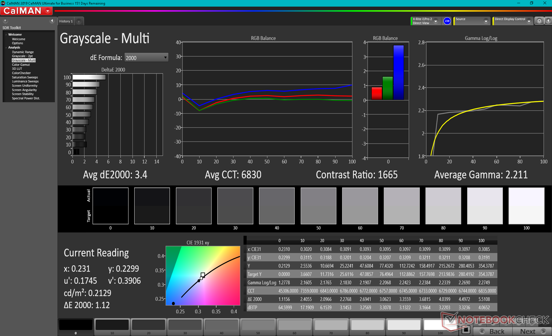 Das Display ist ab Werk bereits vorkalibriert, es ist allerdings noch nicht ganz perfekt. Bei unseren mit Hilfe eines X-Rite Colorimeters durchgeführten Messungen konnten wir durchschnittliche Delta-E-Werte von 3,5 und 2,17 für Graustufen und Farben ermitteln, was durchaus Verbesserungspotenzial andeutet. Mittels individueller Kalibrierung konnten wir diese denn auch auf nurmehr 1,1 und 1,05 senken.
