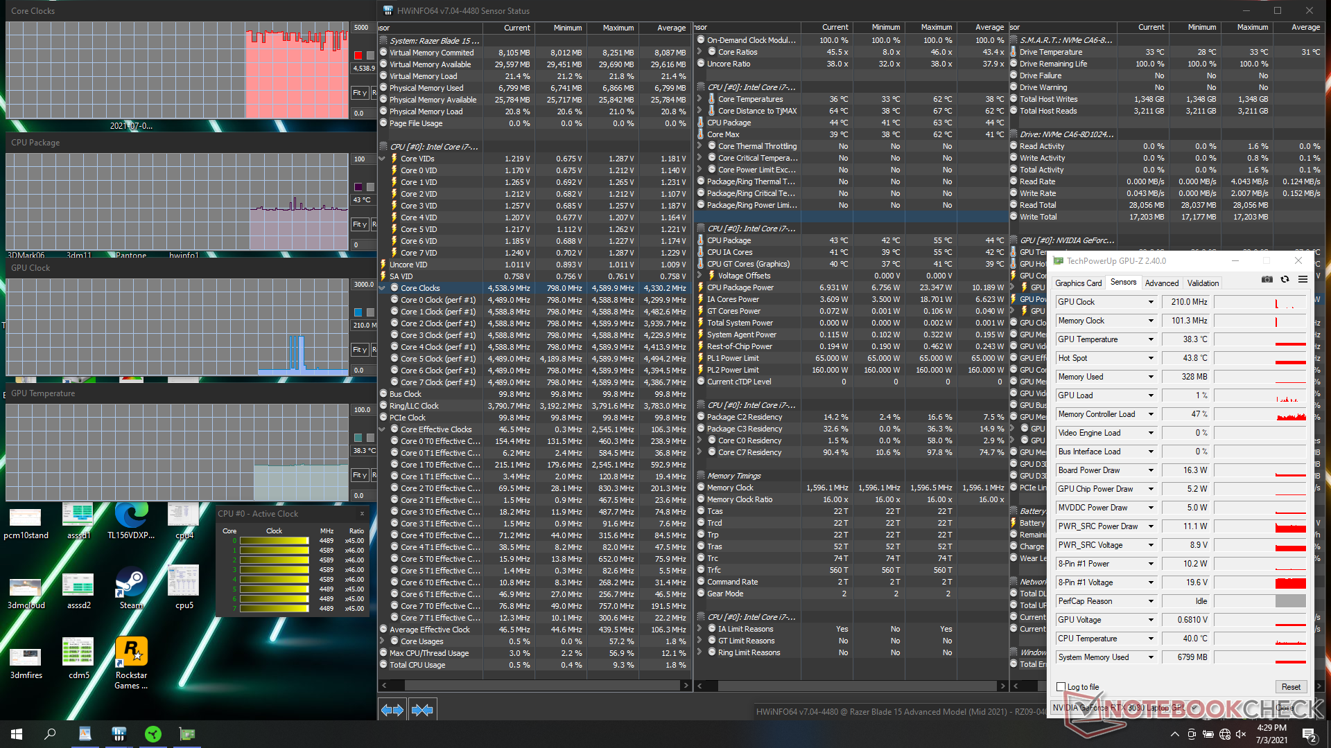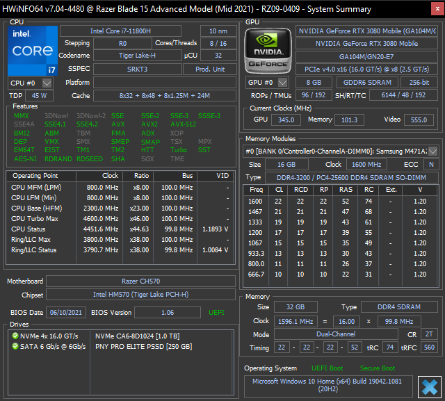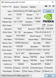 | Razer Blade 15 Advanced (Mid 2021) i7-11800H, GeForce RTX 3080 Laptop GPU, SSSTC CA6-8D1024, IPS, 1920x1080, 15.6" | Razer Blade 15 Advanced Model Early 2021 i7-10875H, GeForce RTX 3080 Laptop GPU, Samsung PM981a MZVLB1T0HBLR, IPS, 1920x1080, 15.6" | Razer Blade 15 RTX 2080 Super Max-Q i7-10875H, GeForce RTX 2080 Super Max-Q, Samsung PM981a MZVLB1T0HBLR, IPS, 1920x1080, 15.6" | Asus TUF Gaming F15 FX506HM i7-11800H, GeForce RTX 3060 Laptop GPU, SK Hynix HFM001TD3JX013N, IPS, 1920x1080, 15.6" | Alienware m15 R5 Ryzen Edition R7 5800H, GeForce RTX 3060 Laptop GPU, Toshiba KBG40ZNS512G NVMe, IPS, 1920x1080, 15.6" | Aorus 15P YD i7-11800H, GeForce RTX 3080 Laptop GPU, Samsung PM9A1 MZVL21T0HCLR, IPS, 1920x1080, 15.6" | |