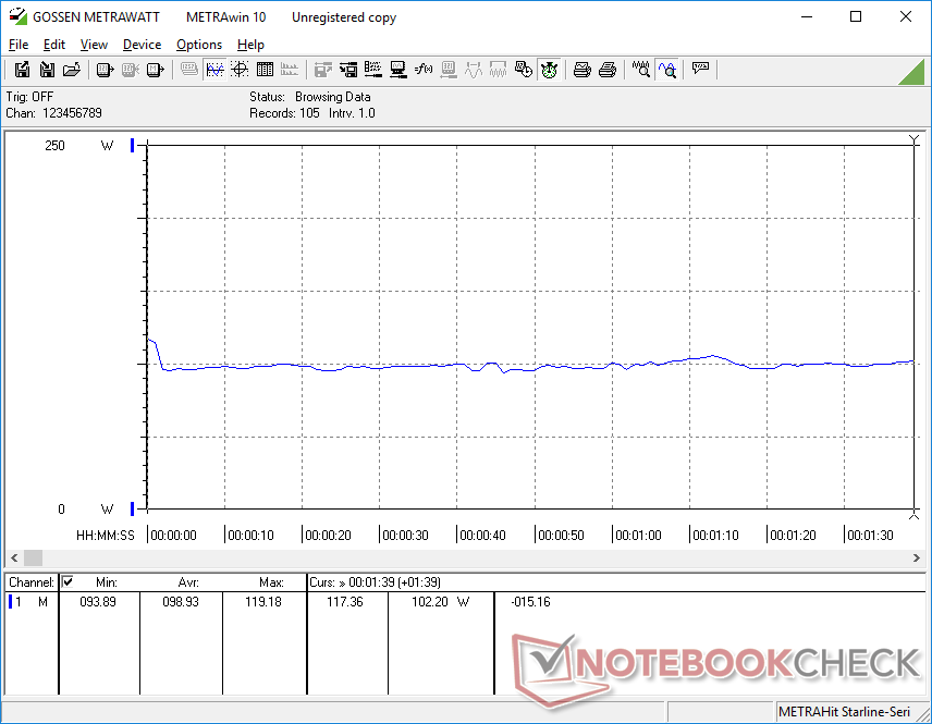 Bei der Ausführung von Witcher 3 konnten wir einen Energiebedarf von 174 W messen, was zwar viel ist, aber noch unterhalb des mit derselben CPU-GPU-Kombination ausgestatteten Aorus 15P liegt. In der Spitze gönnte sich der Laptop rund 214 W, die durch das mittelgroße (ca. 17 x 7 x 2,5 cm) 230-W-Netzteil gezogen wurden.