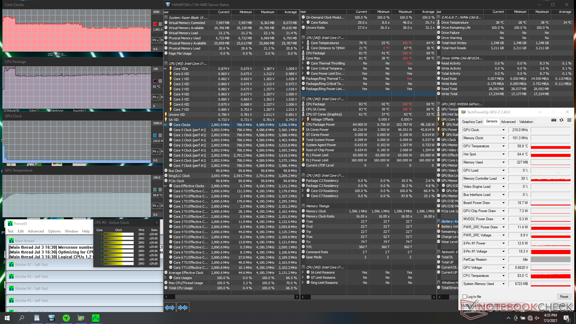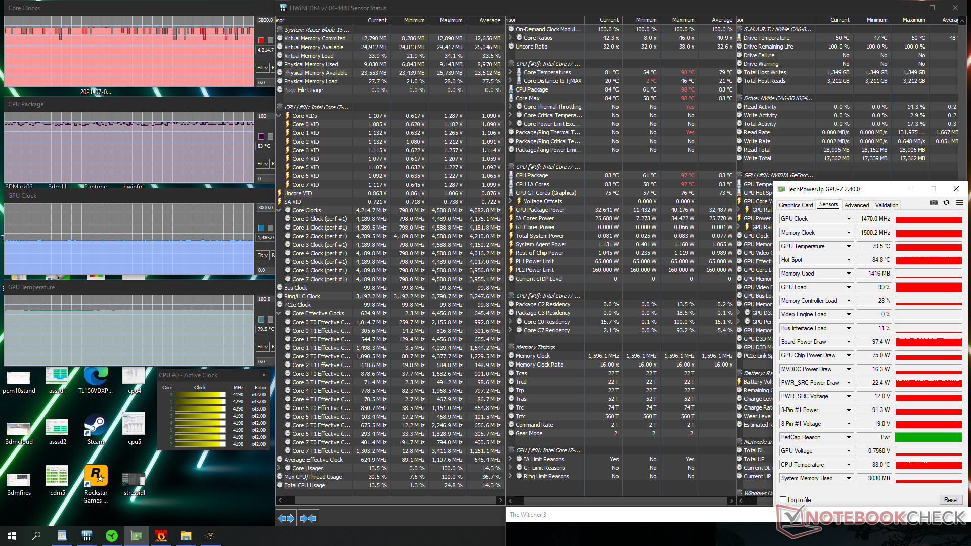 Während der Ausführung von Witcher 3 pendelten sich CPU- und GPU-Temperatur bei jeweils 83 und 80 °C ein, verglichen mit 73 und 71 °C des Vorgängermodells. Die Temperaturen waren also eindeutig höher als zuvor, dem gegenüber steht allerdings auch eine insgesamt deutlich gesteigerte Performance, wie den Benchmarks weiter oben entnommen werden kann. Verantwortlich für die höheren Temperaturen sind sehr wahrscheinlich die angehobenen PL2- und TGP-Limits. GPU-Z zufolge lag der Energiebedarf der GPU bei rund 97 W und somit etwas unterhalb der theoretisch maximal möglichen 105 W.