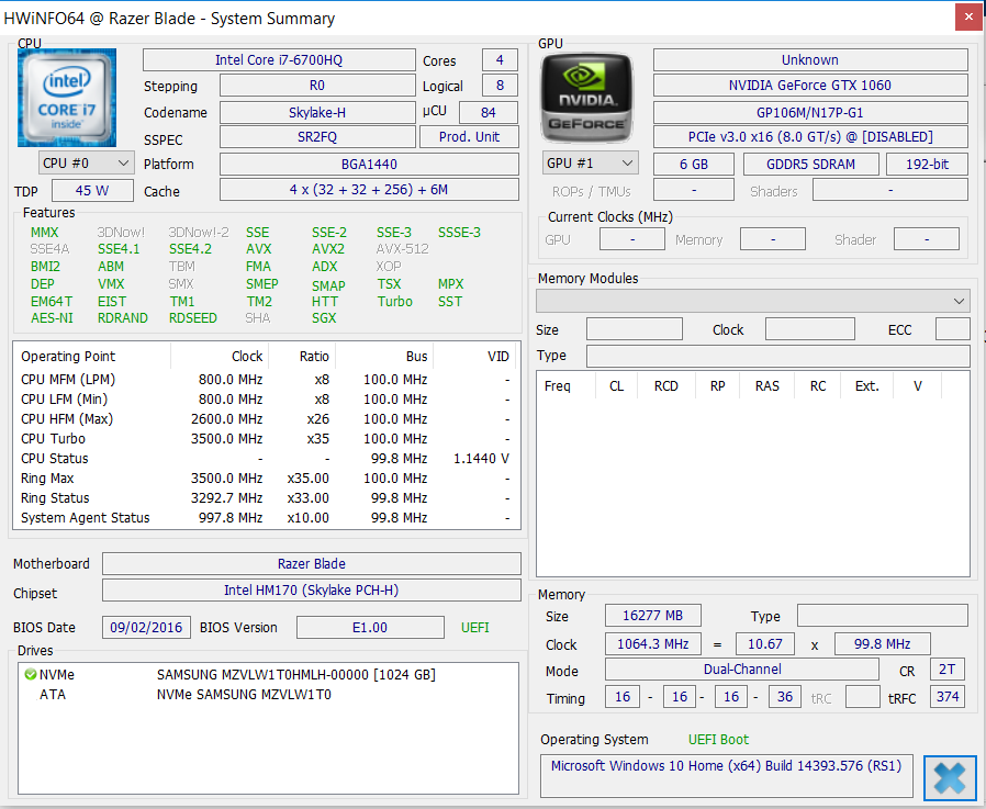 | Razer Blade (2016) FHD | Razer Blade (2016) Samsung PM951 NVMe MZVLV512 | MSI GS43VR 6RE-006US SanDisk SD8SN8U1T001122 | Gigabyte P34W v5 Samsung SSD 950 Pro 512GB m.2 NVMe | Schenker XMG P406 Samsung SM951 MZHPV256HDGL m.2 PCI-e | Asus Strix GL502VM-FY039T Micron SSD 1100 (MTFDDAV256TBN) | |