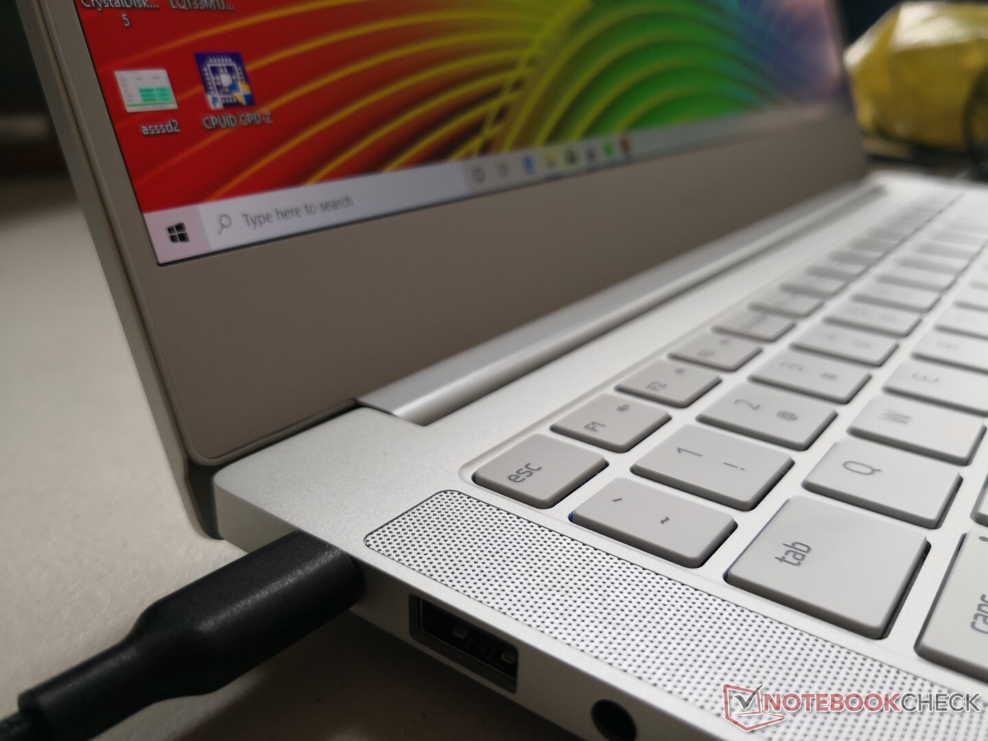 Die maximale Leistung, die dem kleinen (~10,8 x 3,5 x 2,7 cm) 65-W-Netzteil abverlangt wurde, lag bei 50,2 W. Im Gegensatz zum älteren Whiskey-Lake-U-GeForce-Modell entlädt sich dieses Ice-Lake-Modell im Gaming-Betrieb bei angeschlossenem Netzteil im Laufe der Zeit nicht.