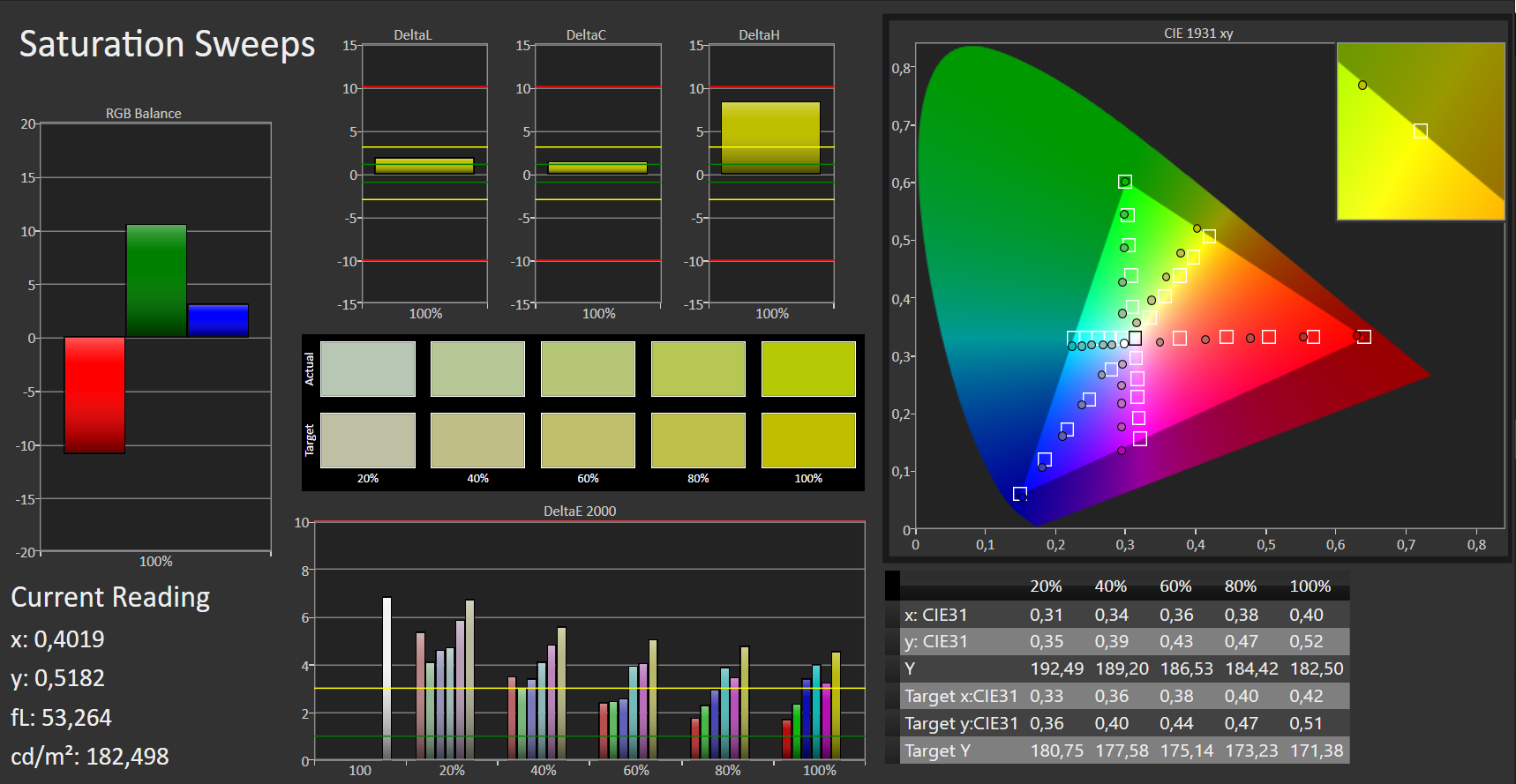 | Delta E Graustufen * | 5.49 | 2.6 53% | 4.6 16% | 1 82% |