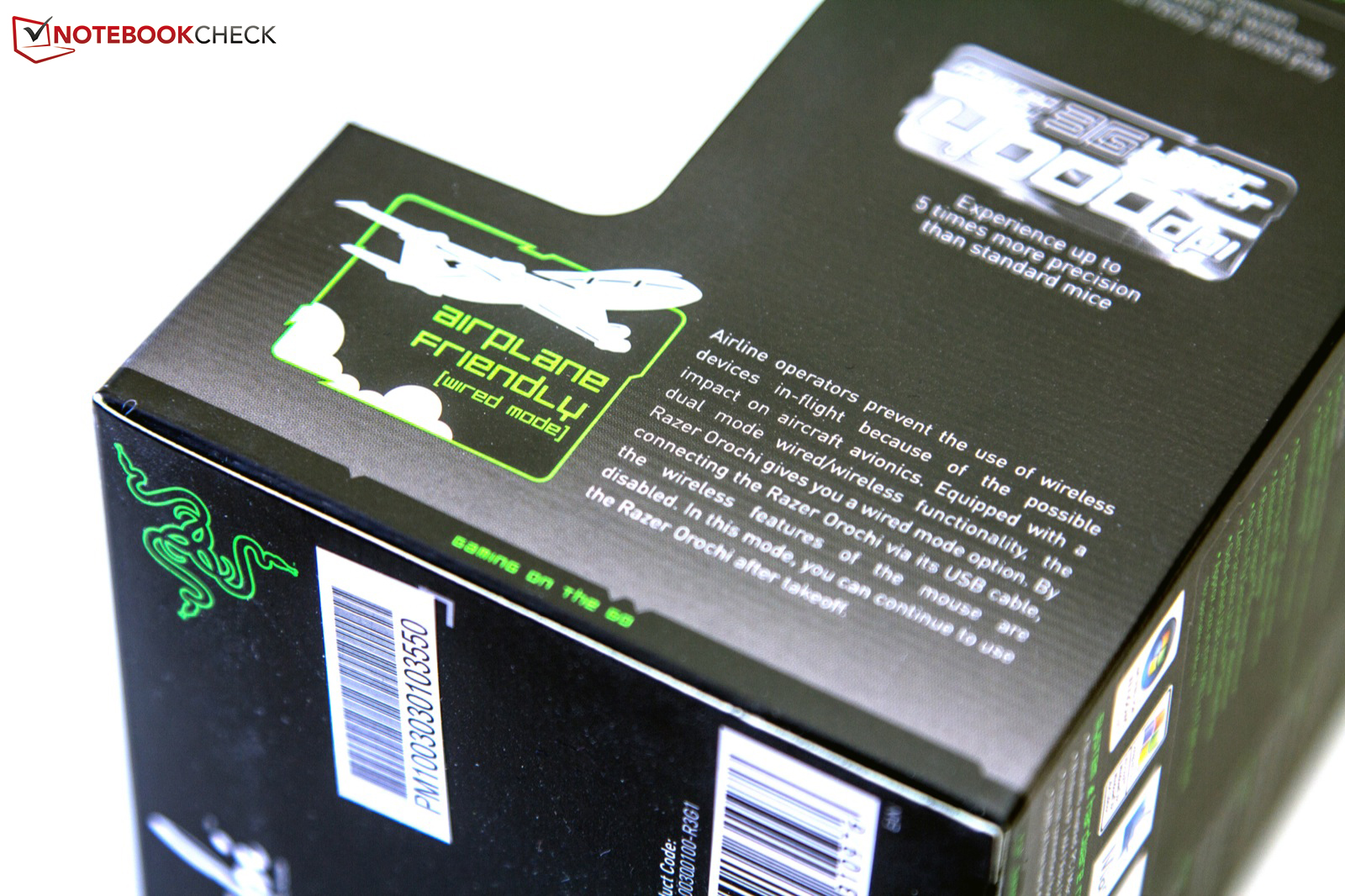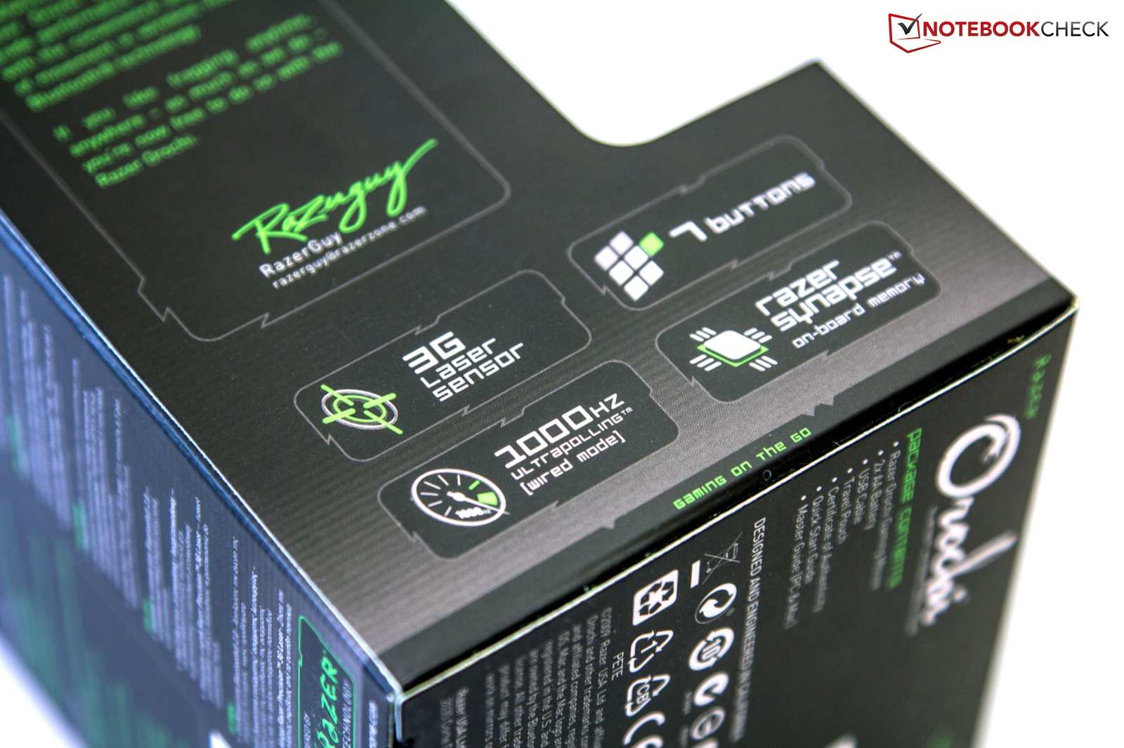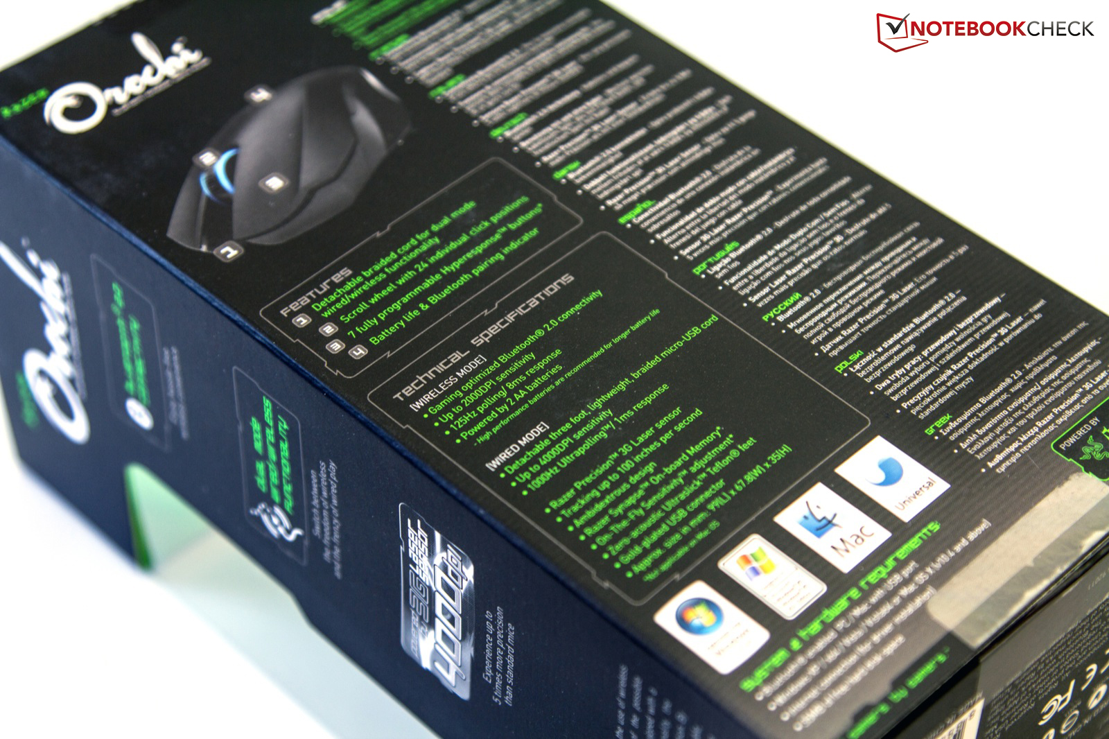 Neben den insgesamt sieben Tasten ist der integrierte Sensor der wohl wichtigste Faktor. Razer nennt diesen Precision 3G Laser Sensor. Dieser bietet eine Sensitivität von 4000 DPI bei einer Reaktionszeit von nur einer Millisekunde dank 1000 Hz Übertragungsrate. Im Wireless-Betrieb sind allerdings nur 2000 DPI bei einer Reaktionszeit von 8 Millisekunden möglich. Je nach Anwendung lässt sich die Maus via Bluetooth 2.0 oder dem mitgelieferten USB-Kabel mit dem Notebook verbinden.