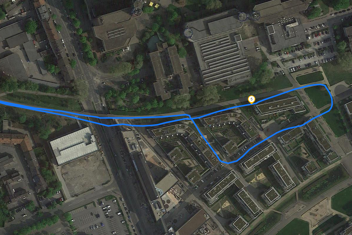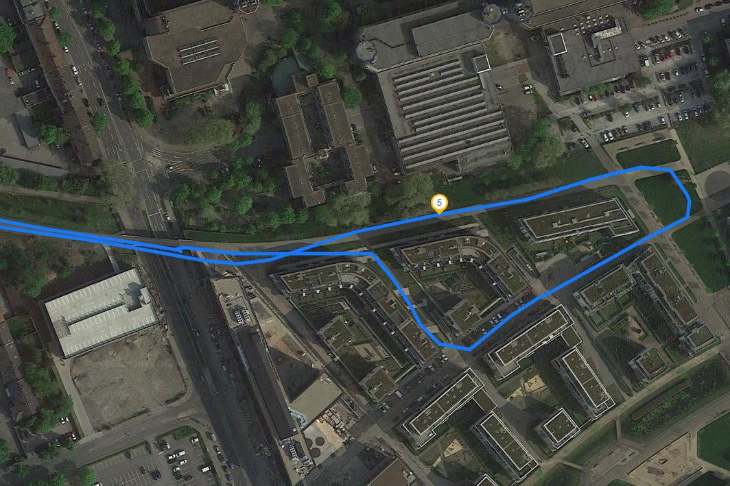 Da ist es fast verwunderlich, dass in dem anschließend angefahrenen Wohngebiet kleine Abweichungen auftauchen. Allerdings nimmt hier nicht nur das RG655 an einer Stelle eine Abkürzung über die Wiese, sondern – an anderer Stelle – auch das Garmin 500 Edge, was ein Hinweis auf allgemein schlechtere Bedingungen in diesem Abschnitt sein kann.