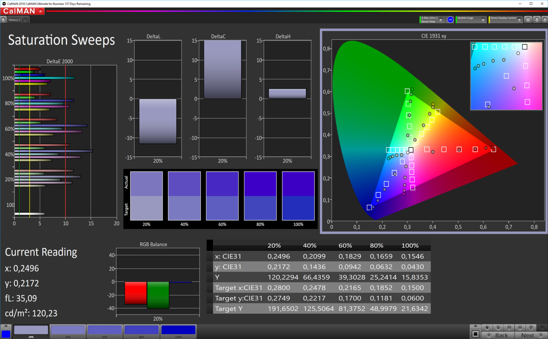 Das Spektralfotometer und die Analyse-Software CalMAN ermitteln zum Teil hohe Abweichungen bei der Farbdarstellung. Mit bloßem Auge ist dagegen allenfalls ein leichter Farbstich erkennbar, weil die einzelnen Ausreißer in unterschiedlichen Wellenlängenbereichen liegen und sich zum Teil ausgleichen.