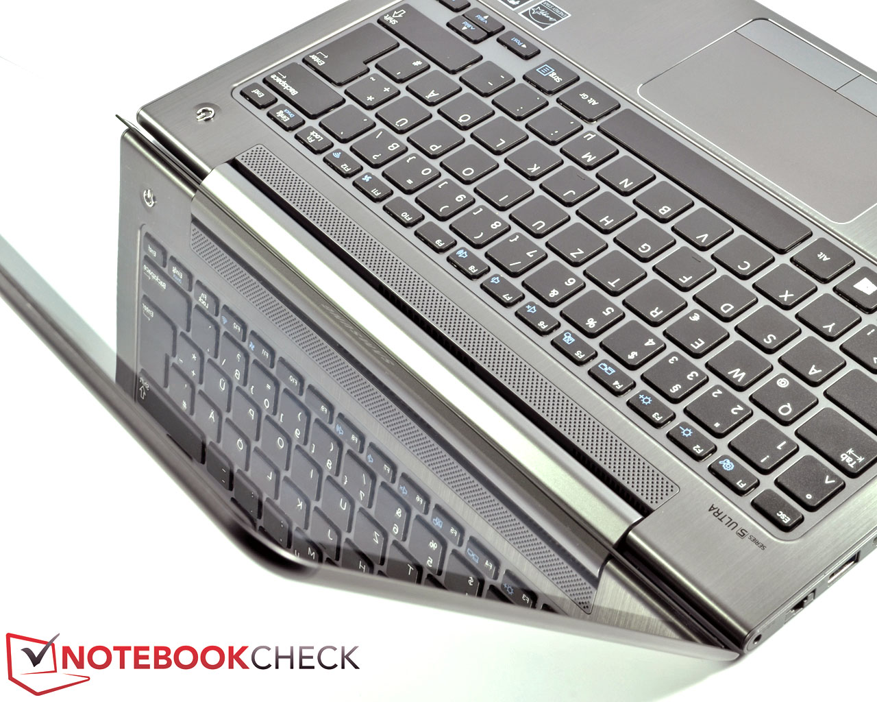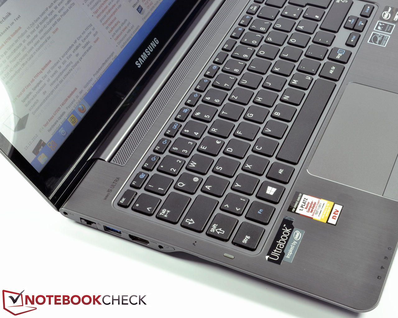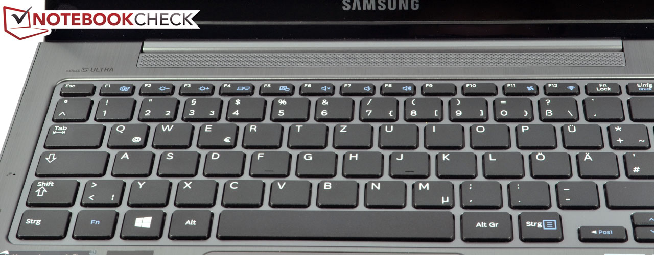 Auch bei den Eingabegeräten hat Samsung nichts verändert. Die Chiclet-Tastatur weist wie schon beim Serie 5 530U3C Ultrabook einen ordentlichen Druckpunkt bei mittellangem Tastenhub auf. Das Tippgeräusch ist angenehm leise. Auch bei energischem Anschlag gibt das Tastaturbett kaum nach und garantiert so ein deutliches Feedback und präzise Eingaben. Auf einen separaten Ziffernblock hat Samsung aufgrund der kompakten Chassisgröße verzichtet, auch ein in das Tastenfeld integrierter Zahlenblock fehlt.