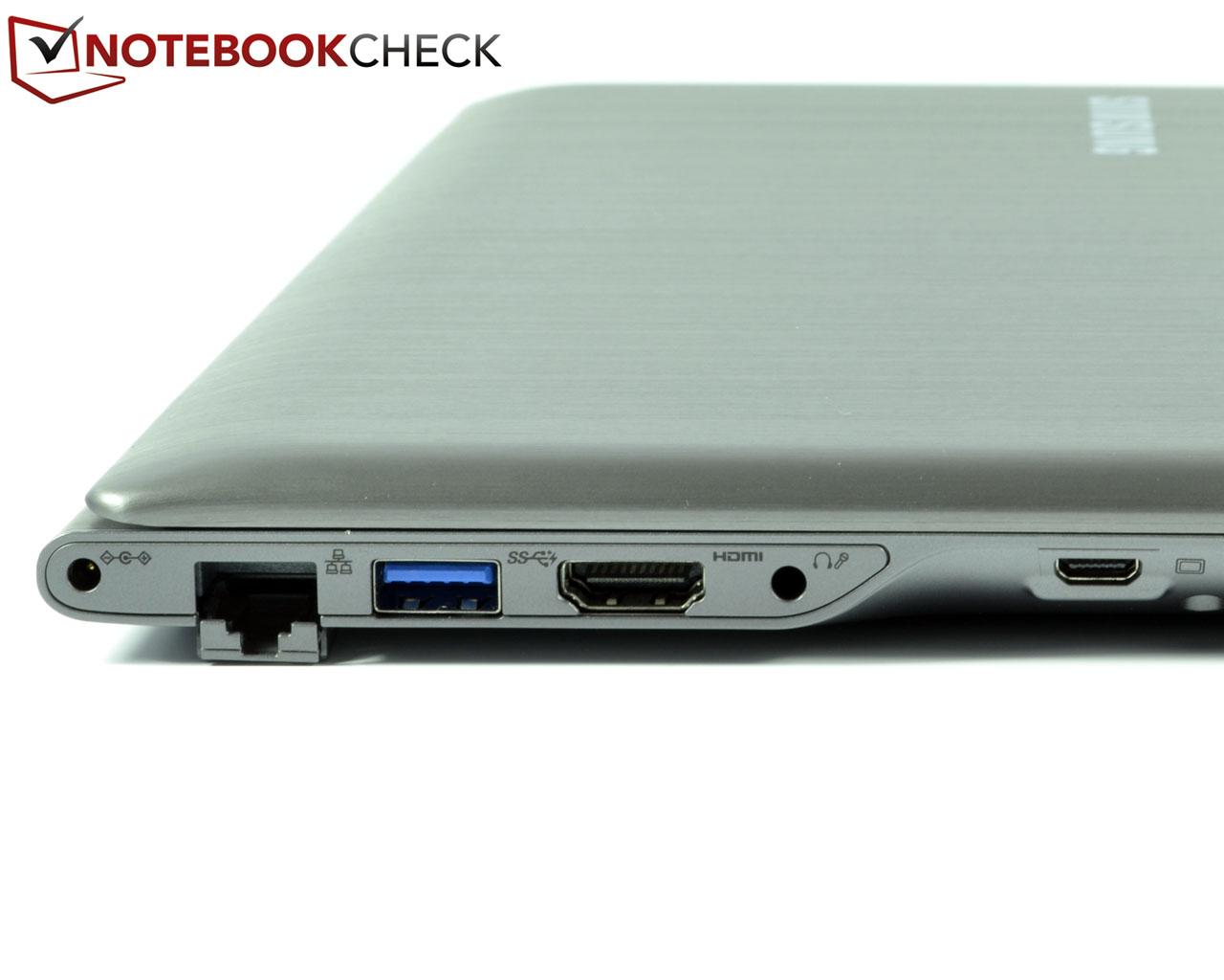 In der Regel glänzen Ultrabooks nicht unbedingt mit einer Vielfalt an Schnittstellen. Auch das Samsung Serie 5 540U3C macht da keine Ausnahme und übernimmt den Umfang des 530U3C vollständig. Das Nötigste ist trotz aller Knauserei an Bord: USB 3.0 – check. SD-Kartenleser – check. HDMI- und Mikro-HDMI-Ausgänge – check, für VGA wird jedoch ein zusätzlicher Adapter für saftige 30 - 40 Euro fällig, der beim 530U3B noch zum Lieferumfang zählte. Da die Ports jeweils sehr dicht beieinander liegen, können dickere Stecker die Nebenschnittstelle blockieren. An eine Gigabit-LAN-Schnittstelle hat man auch gedacht, diese ist klappbar ausgeführt, um die geringe Bautiefe des Chassis einhalten zu können.