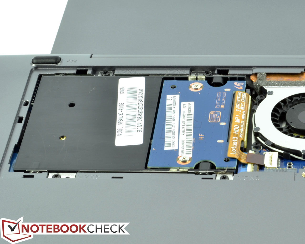 Die SSD ist im Testgerät per mSATA angebunden, sitzt jedoch in einem Rahmen an dem Platz, an dem beim Vorgänger noch die HDD war. Es ist also möglich, eine per SATA verbundene SSD mit 2,5-Zoll-Formfaktor einzubauen.