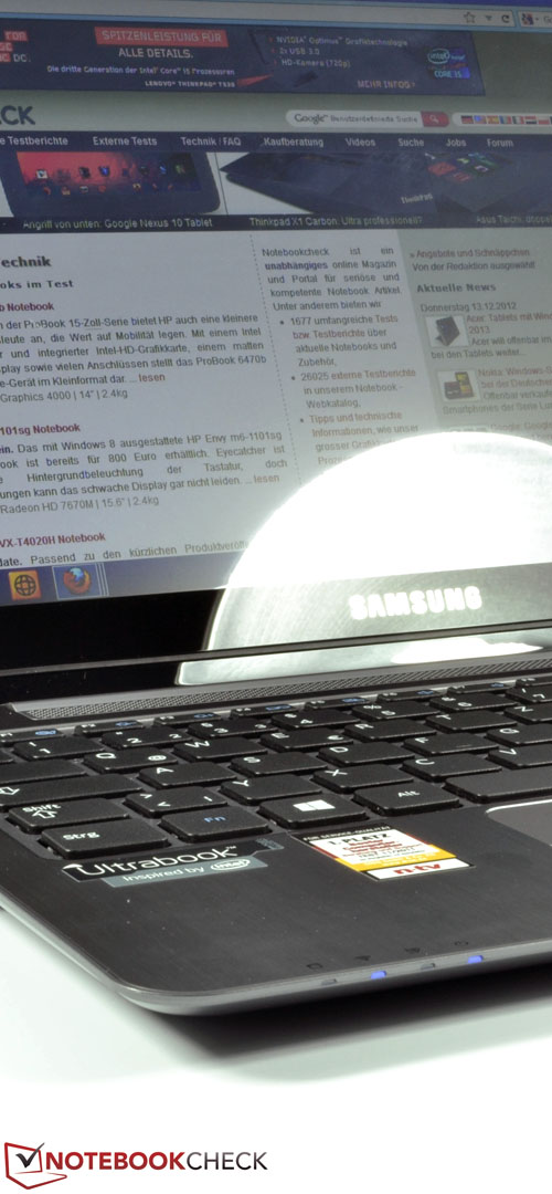 Spiegelnde Oberflächen wie beim Testgerät sind bei Ultrabooks gängig, nur wenige Ausnahmen wie beispielsweise der Vorgänger Samsung Serie 5 530U3C, das Fujitsu LifeBook U772 oder auch das Asus Zenbook Prime UX31A besitzen ein mattes Display. Das glänzende WXGA-Display des Testgerätes reflektiert Umgebungslicht sehr stark und kann bei Außeneinsätzen nur in schattigen Plätzen gut abgelesen werden, auch wenn die Leuchtdichte im Akkubetrieb nicht abnimmt.