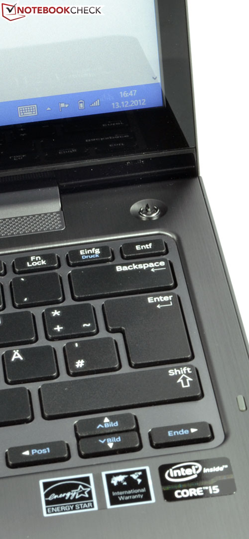 Trotzdem sind die Abstände zwischen den einzelnen Tasten großzügig bemessen. Die Pfeiltasten sind in der Höhe nur halb so groß wie der Rest des Tastenfeldes ausgeführt. Diverse Sondertasten wie die Regulierung der Lautstärke oder der Bildschirmhelligkeit werden durch eine Kombination mit der Fn-Taste aktiviert. Die blaue Beschriftung hebt sie vom Rest der Tasten hervor, ist aber bei schlechtem Umgebungslicht schwer zu erkennen. Leider sind die Tasten immer noch nicht hintergrundbeleuchtet. Insgesamt ermöglicht die Tastatur schon nach kurzer Eingewöhnungszeit ein sicheres, produktives Tippen.